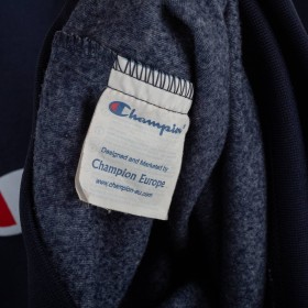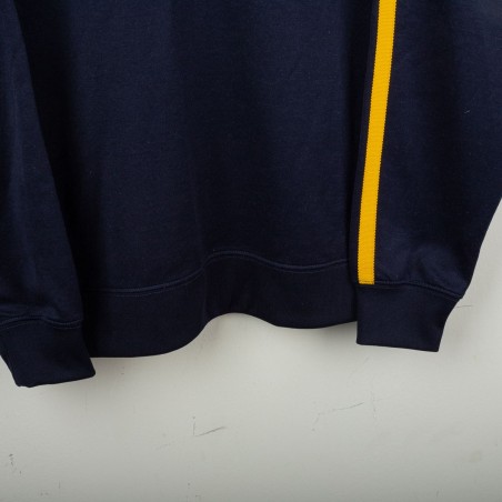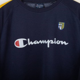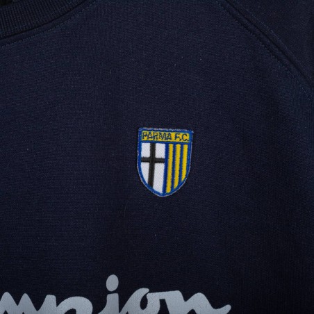 Parma training sweatshirt from the 2003/2004 season, made by Champion. Navy blue base with yellow details along the sleeves. Champion logo printed on the chest and back, with Parma F.C. stitched crest on the left chest. Additional Champion logos on the sleeves. Crewneck model in brushed cotton, perfect for training and leisure. Size XL. A vintage and iconic piece from Parma’s golden era.