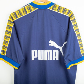 Official Parma Calcio training shirt from the 1995/1996 season, made by Puma. Blue technical fabric with yellow and blue sleeve and collar details. White Parmalat sponsor, Puma logo, and Parma A.C. crest printed on the chest. Classic design with Puma King tape on the shoulders — a true symbol of the club’s golden era.