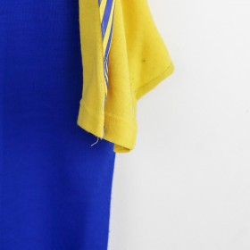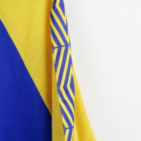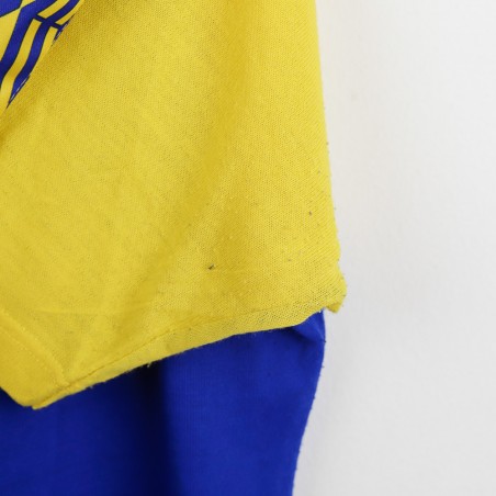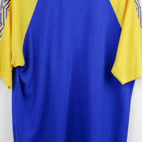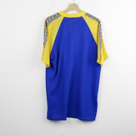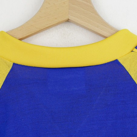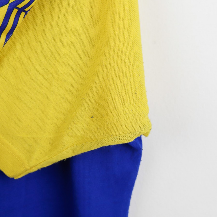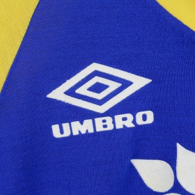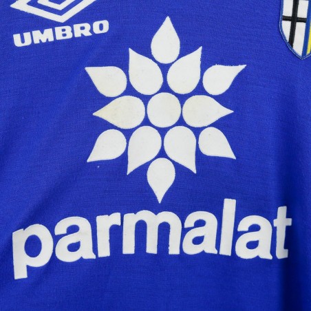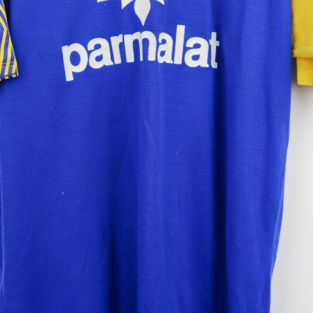 Parma training t-shirt from the 1993/1994 season, made by Umbro. The shirt features a bright blue body with yellow sleeves, embellished by a geometric pattern on the shoulders. Umbro logo and Parmalat sponsor on the chest alongside the Parma club crest. Yellow V-neck collar. Size XL.