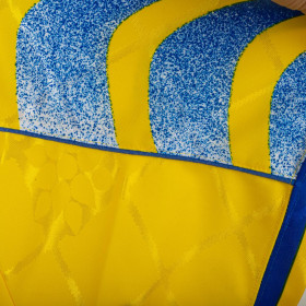 Parma A.C. away shirt from the 1995/1996 season, made by Puma. Yellow with blue accents and geometric embossed pattern. Puma logo and Parmalat sponsor applied. Parma A.C. crest applied on the chest. "Cannavaro" and number 17 on the back in official style. Regular fit, size XL. Made in Italy.