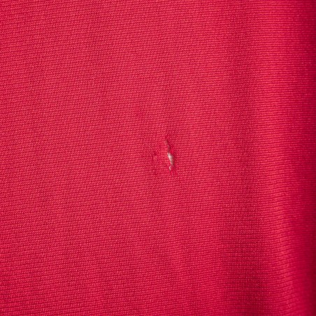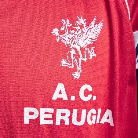Perugia full zipper jacket season 1991/1992 red color with white and blue inserts. The AC Perugia logo and lettering are painted on the front, heart side, while the logo and lettering of the commercial sponsor Cassa di Risparmio di Perugia are painted on the right side, along with the sewn-in logo of the technical sponsor 2T Sport. The coats of arms of Perugia are in the weave on the shoulders.