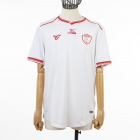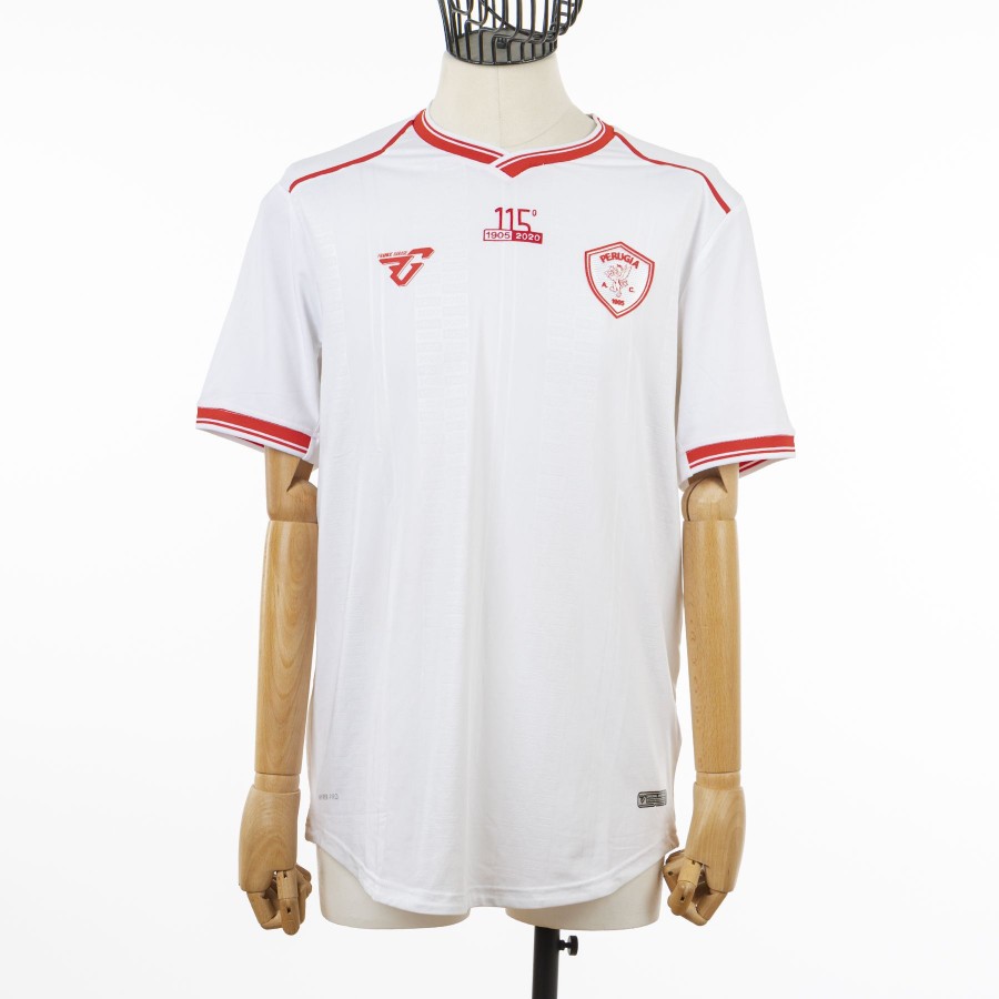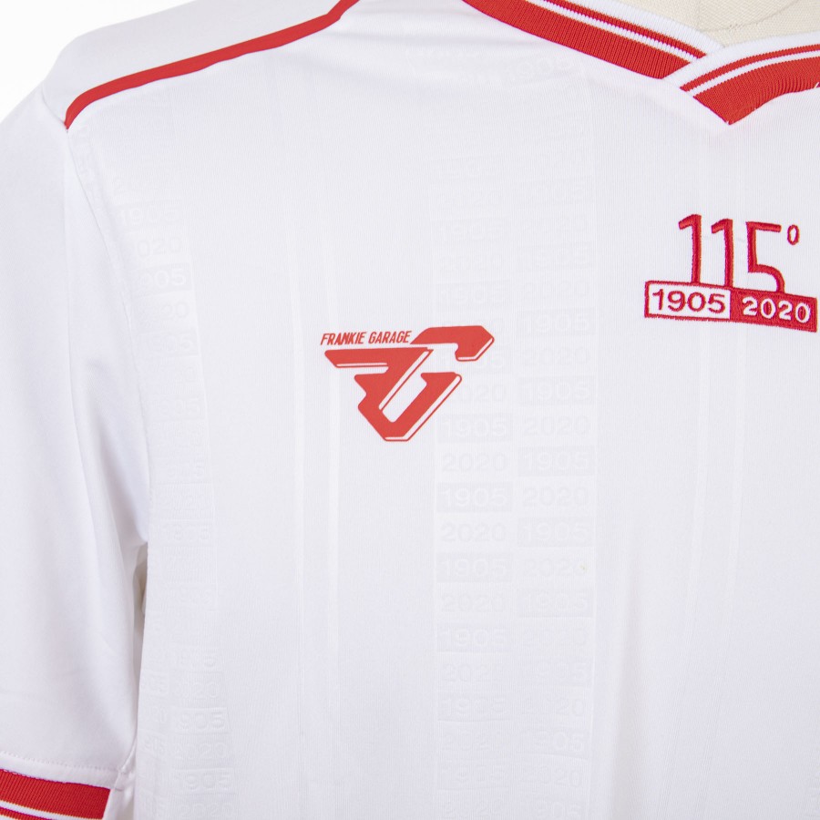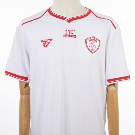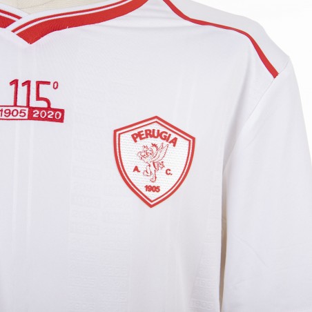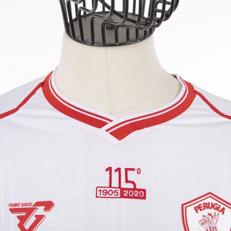 White short-sleeved away shirt model with red inserts. The kit is inspired by the 115-year history of the red and white club. The “115” branding is placed in embroidery at the center of the chest to celebrate and remember the wonderful and long history of A.C. Perugia. The collar has an important historical reference: the V-neck formed by the overlapping of the rib, like that of the 1987-1988 season of Ravanelli's Perugia. The logo of the technical sponsor Frankie Garage is applied on the right chest, while the Perugia company crest is applied to the heart side.