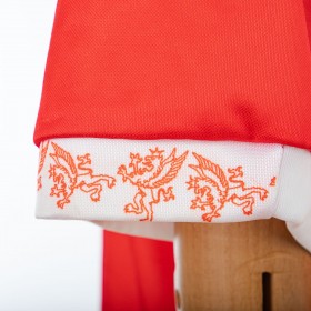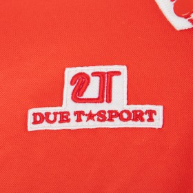 The product can be clearly seen from the various photos. The shirt has short sleeves, has a white stand-up collar that closes with a button and its predominant color is red, even if the aforementioned white is also present on the edges of the sleeves; above, slightly set back to the right, the 2T Sport logo is applied, with a combination of white and red; descending, there is a large white griffin in sublimation, the symbol of Perugia; further down, still in sublimation, the wording CASSA RISPARMIO PERUGIA is applied, in white.