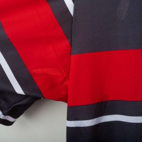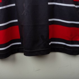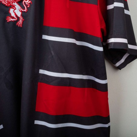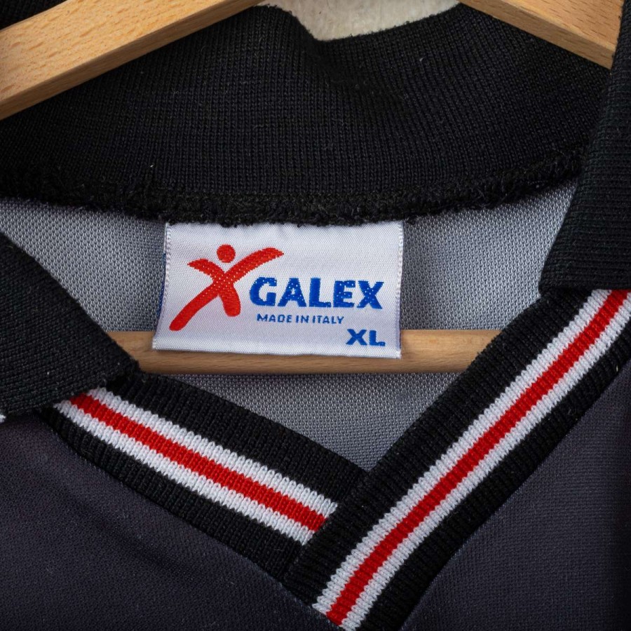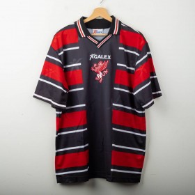 Perugia third shirt from the 1998/1999 season, made by Galex. Unique design with black base and bold red and white horizontal stripes. Embroidered Galex logo and club’s griffin crest on chest. Polo collar with red-white detailing. Worn by Ecuadorian forward Iván Kaviedes, number 33. Size XL. An eccentric and rare vintage piece from the late '90s, symbol of Perugia’s bold football identity.