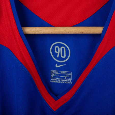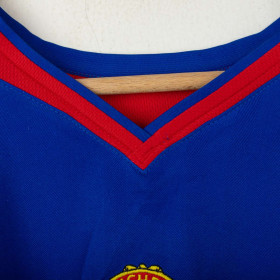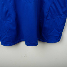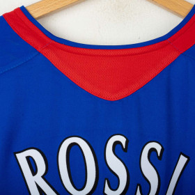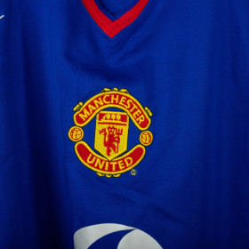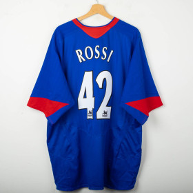 Manchester United away shirt from the 2005/2006 season, made by Nike. Short sleeves, blue base with red details on shoulders and sleeve edges. Embroidered Nike logo, stitched club crest on the chest, and printed Vodafone sponsor. Official Premier League name and number set “ROSSI 42” on the back, complete with authentic league patches. Oversized fit, size 3XL.