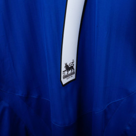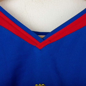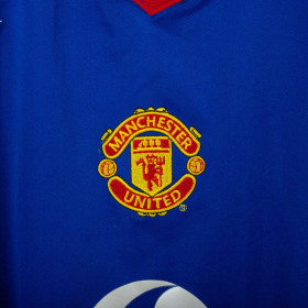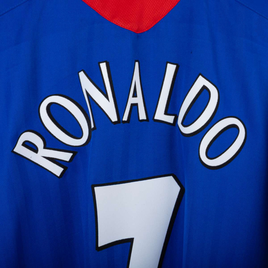 Manchester United away shirt from the 2005/2006 season, customized with Cristiano Ronaldo’s name and number 7. Produced by Nike, it features a blue base with red inserts on the sleeves and collar. Embroidered Nike logo, stitched club crest on the left chest, and printed Vodafone sponsor on the front. Premier League official plastic nameset with lion patches at the bottom of the numbers. Size 3XL, wide fit.