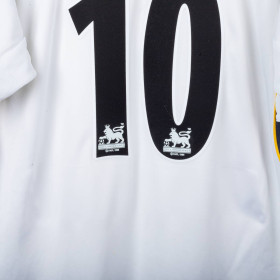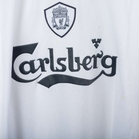 Liverpool away shirt from the 2001/2002 season, made by Reebok. White base with navy panels and yellow piping. Flocked Reebok logo and Carlsberg sponsor on the front. Monochrome embroidered Liverpool crest centered on the chest. “Owen” and number 10 on the back in black. Features Hydromove technology for enhanced breathability. Size XL. Regular fit.