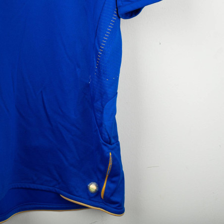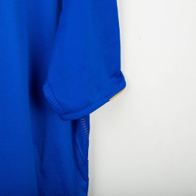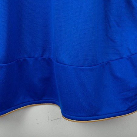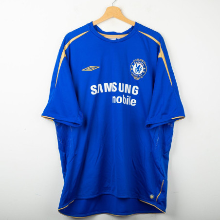 Chelsea home shirt from the 2005/2006 season, made by Umbro for the club’s centenary. Royal blue with yellow shoulder inserts. Stitched centenary crest on left chest with “100 YEARS” and “1905-2005” detail. Embroidered Umbro logo on chest. “Samsung Mobile” sponsor printed in white. “CRESPO” name and number 9 on the back in white with black outline and official Premier League logo at base of number. Crew neck. Size XL.