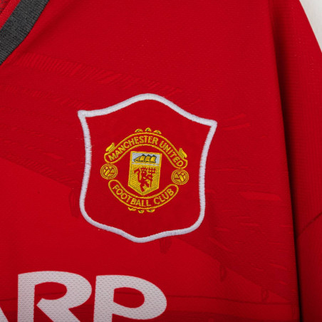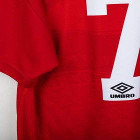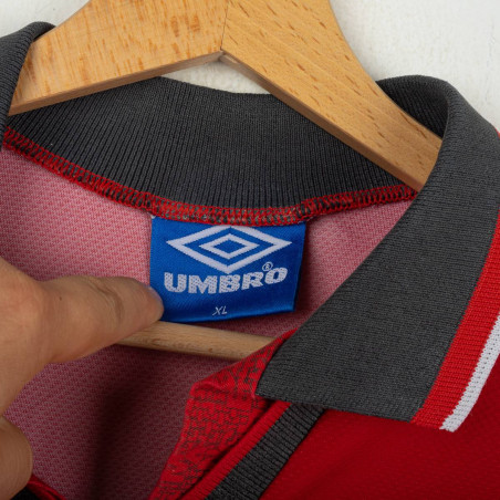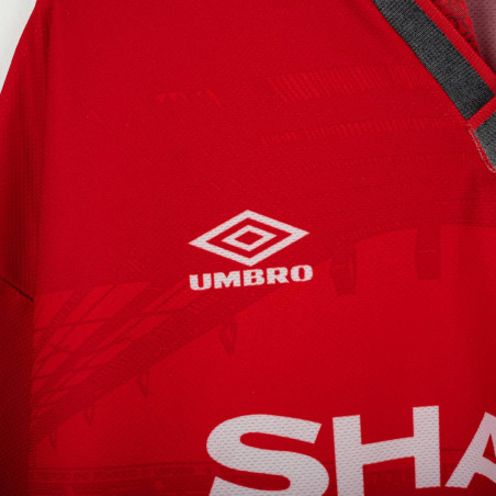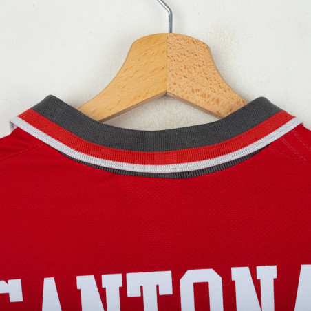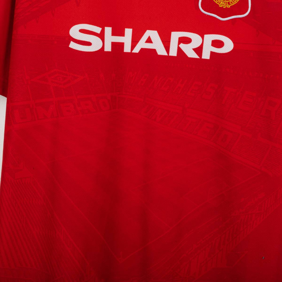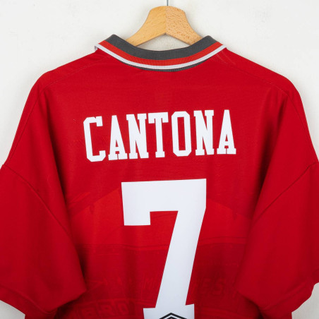 Manchester United home shirt from the 1995/1996 season, produced by Umbro. Classic red design with grey polo collar featuring red and white trim. Embroidered Umbro logo on the right chest, stitched Manchester United crest on the left chest, and Sharp sponsor printed across the front. On the back, Cantona 7 flocked name and number with Umbro logo under the number. Jacquard fabric with Old Trafford details. A historic shirt worn by Eric Cantona during the season that ended with the Premier League and FA Cup double. Size XL.