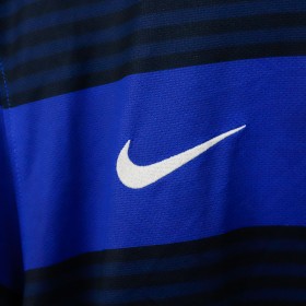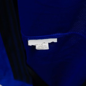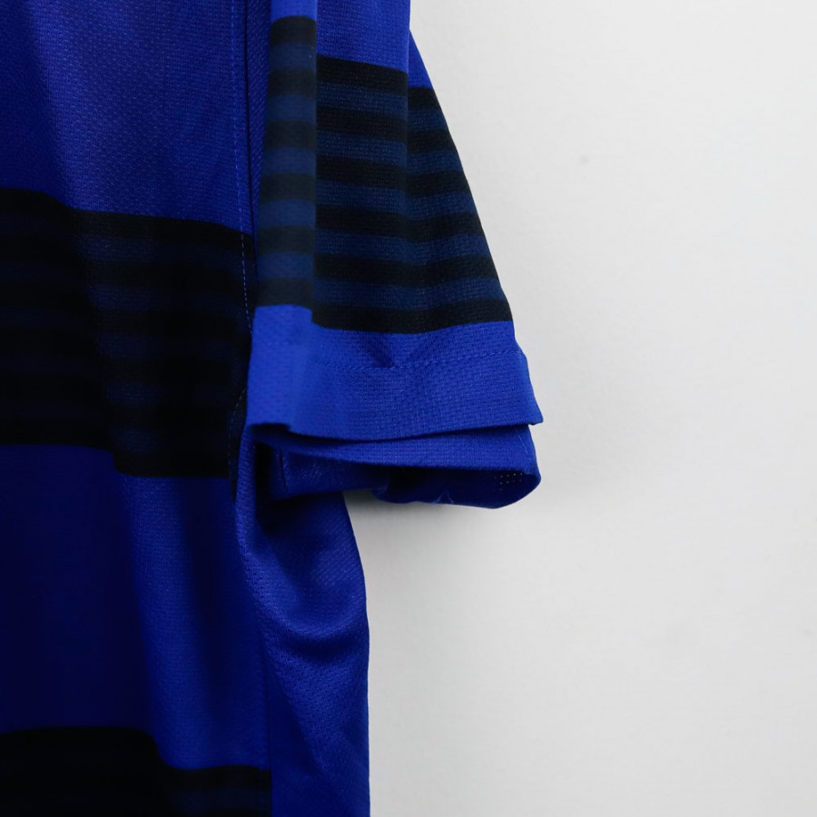 Away shirt worn by Manchester United during the 2011/2012 season, made by Nike and featuring Wayne Rooney with number 10. The Nike technical logo appears on the chest along with the club badge and central sponsor Aon. The shirt features bold blue and black horizontal stripes with a black collar. Size XL as shown on the inner tag. This model recalls a prolific season for Rooney, who scored 34 goals across all competitions and led the Red Devils’ attacking line.