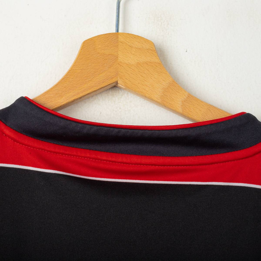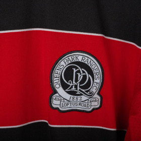 Away shirt of Queens Park Rangers from the 2007/2008 season, size L. Made by Le Coq Sportif, it features the technical sponsor on the chest alongside the club's badge in a stylish monochrome version. The commercial sponsor "Cargiant" is prominently displayed across the front, a long-time partner of the club. The design includes bold red and black horizontal stripes with white detailing, giving it a classic and assertive look.
