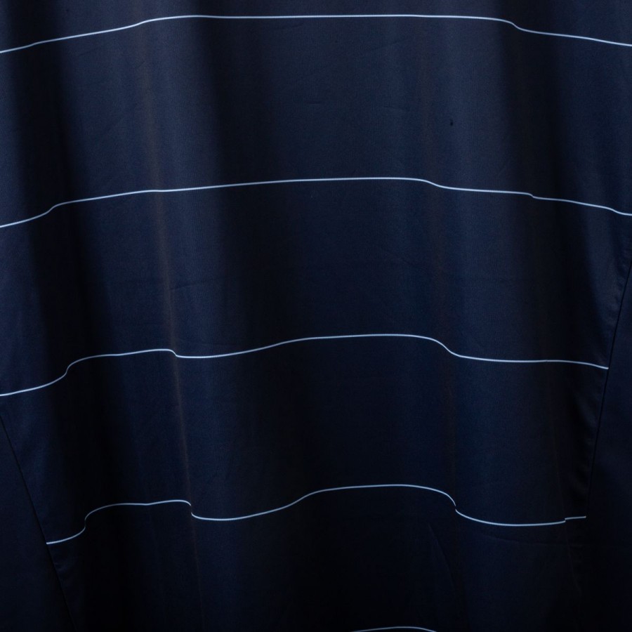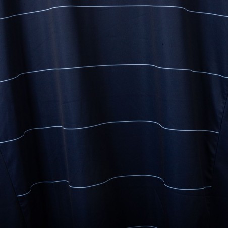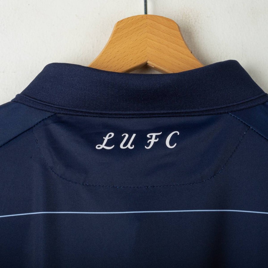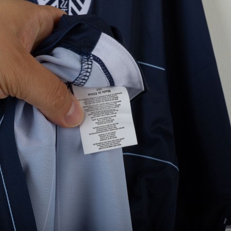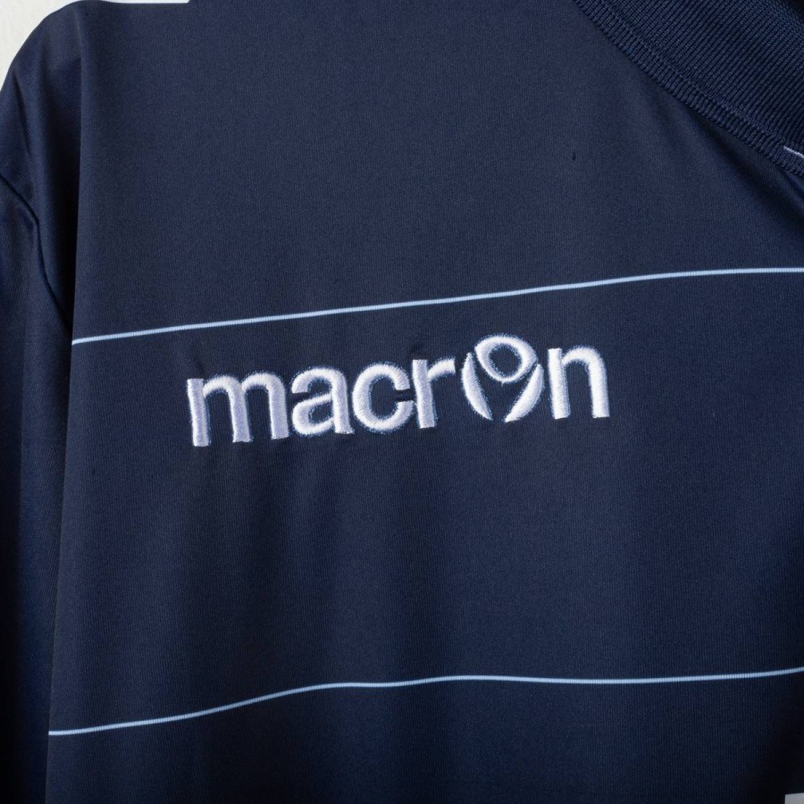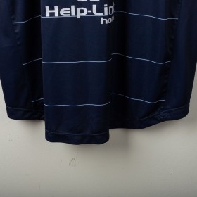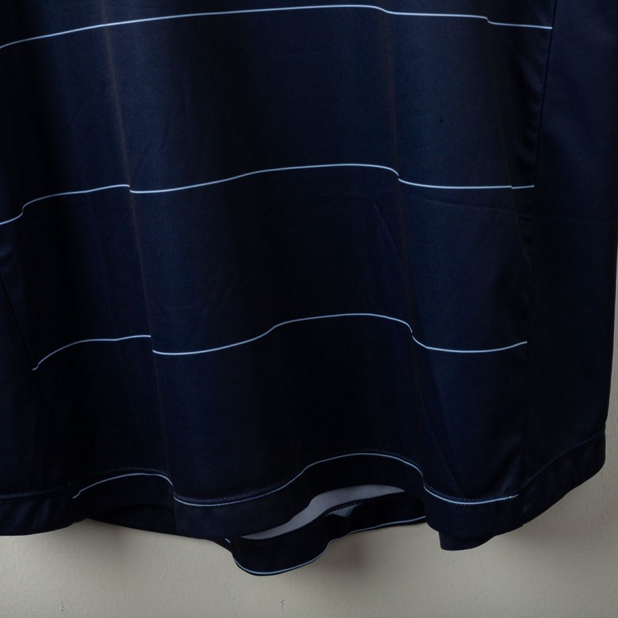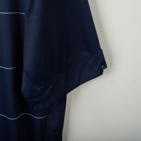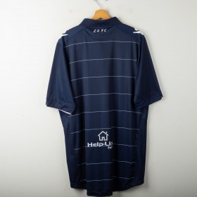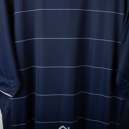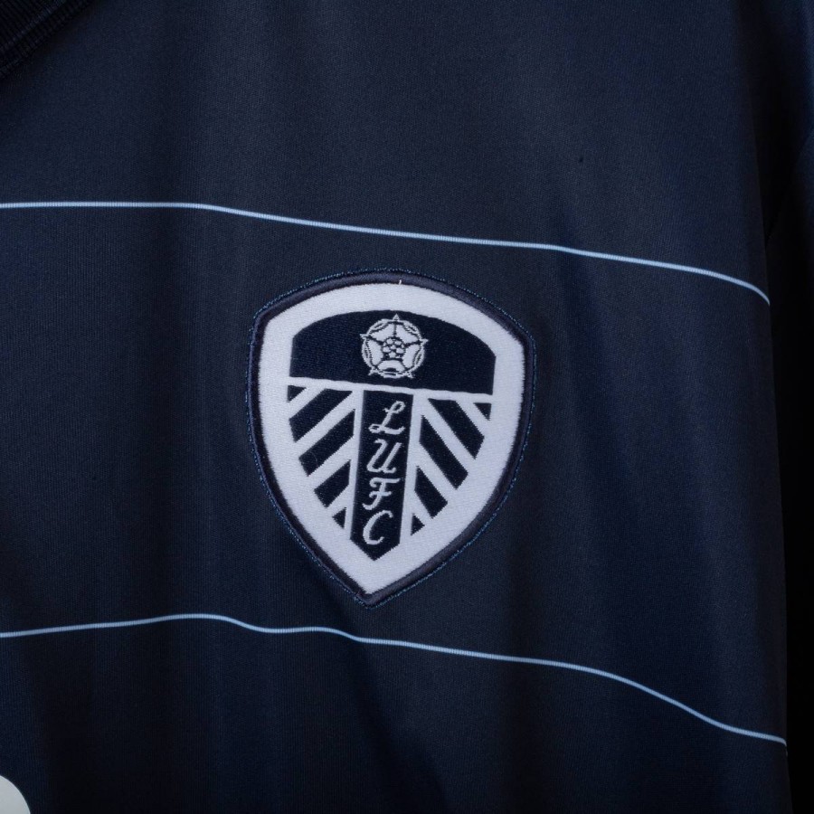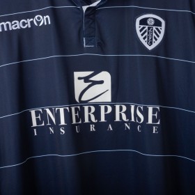 Official Leeds United away shirt for the 2014/2015 season, made by Macron. Features a stylish navy blue base with thin white pinstripes, a polo collar with two-button closure, and embroidered Macron and club logos on the chest. Main sponsor "Enterprise Insurance" is printed on the front, while the back shows “LUFC” lettering and secondary sponsor "Help-Link" at the bottom. Men's size 3XL, complete with original tag. Crafted from breathable technical fabric. In excellent condition – unworn and ideal for collectors or loyal Leeds supporters.