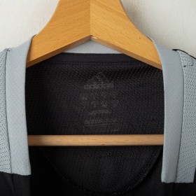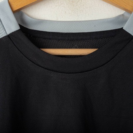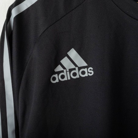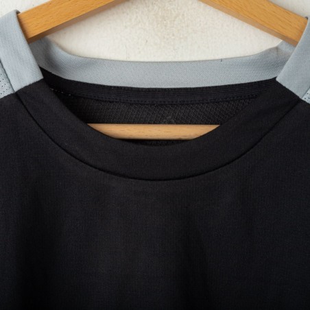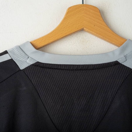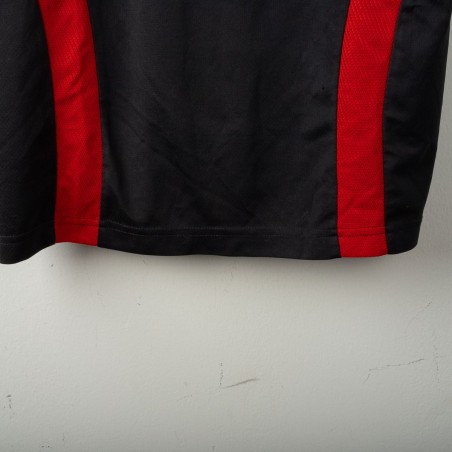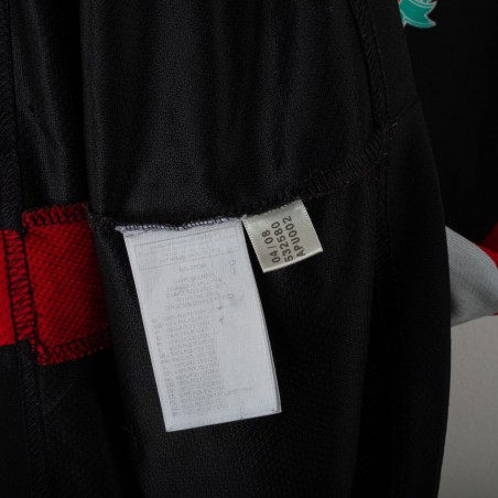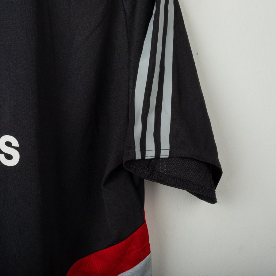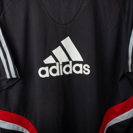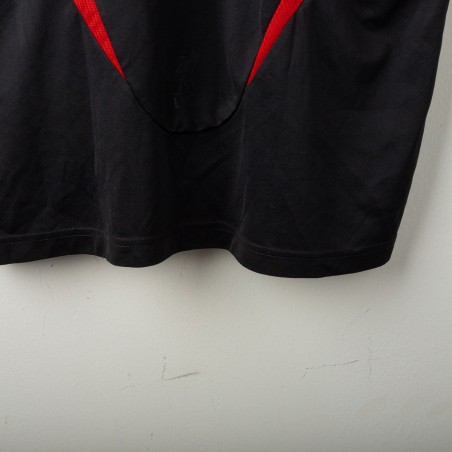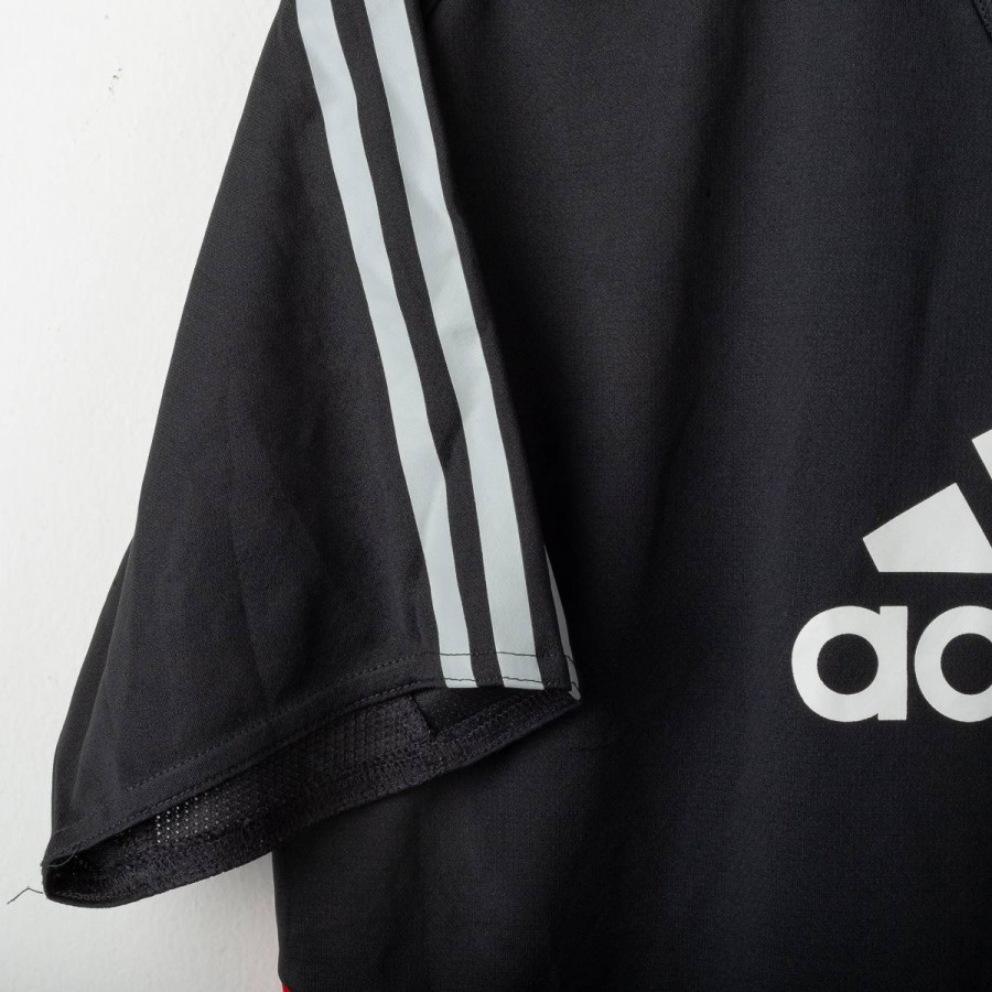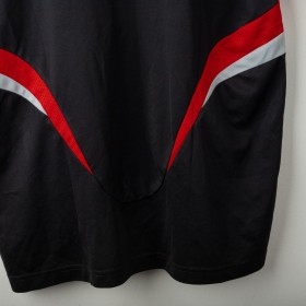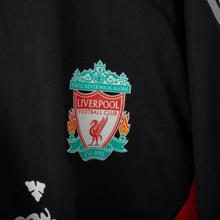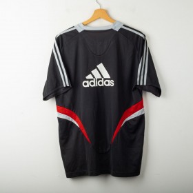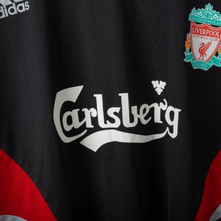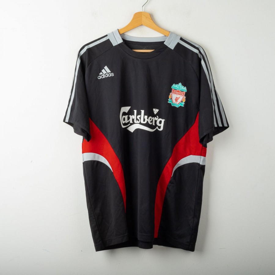 Official Liverpool training shirt for the 2008/2009 season, made by Adidas. This model features a black base with red and white side panels, light grey collar detailing, and the iconic three Adidas stripes on the sleeves. The front displays the Adidas logo, Liverpool crest, and “Carlsberg” sponsor. A large Adidas logo is printed on the back. Made from lightweight technical fabric. Size L.