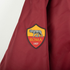 Official AS Roma bomber jacket from the club’s merchandising line. Made of burgundy polyester with gold inner lining, featuring the AS Roma 1927 crest on the sleeve. Elastic collar, cuffs, and hem with yellow and red stripes. Zip closure and side pockets for added comfort — ideal for fans who want to show their Giallorossi pride in style. Size XXL.