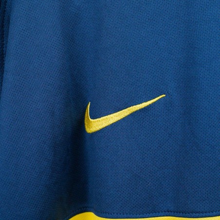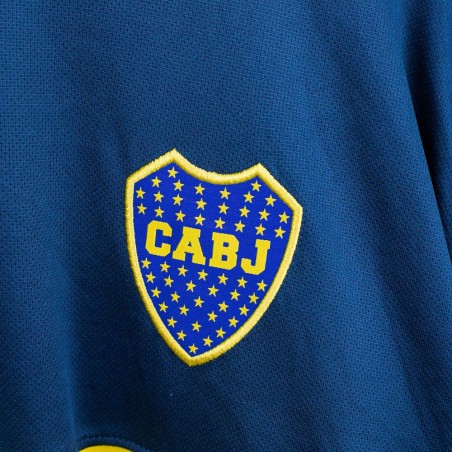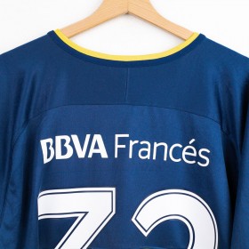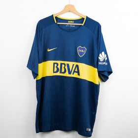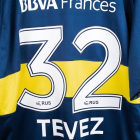 2017/2018 Home Boca Juniors Shirt Tevez 32. Original Nike shirt featuring technical sponsor Nike and commercial sponsors BBVA, BBVA Francés, RUS, and Huawei on the sleeves. Size XXL. The iconic blue shirt with the yellow horizontal band comes in a modern cut with breathable Dri-FIT fabric. The back displays the name and number 32 of Carlos Tevez, a Boca Juniors legend and fan favorite.