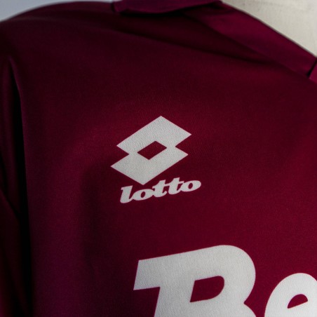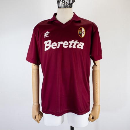 Torino jersey made by the technical sponsor Lotto in the 90s. Model with polo collar and V-neckline with sponsor applications and club emblem in sublimation. The product is in excellent condition and comes with a tag and a rosette from the Italian Cup (not applied).