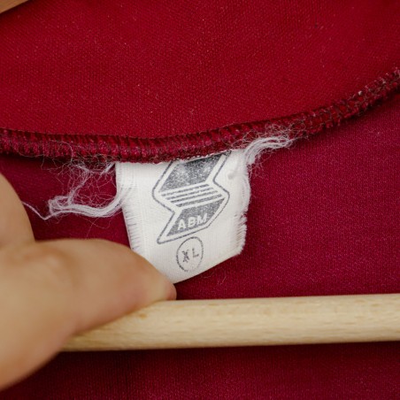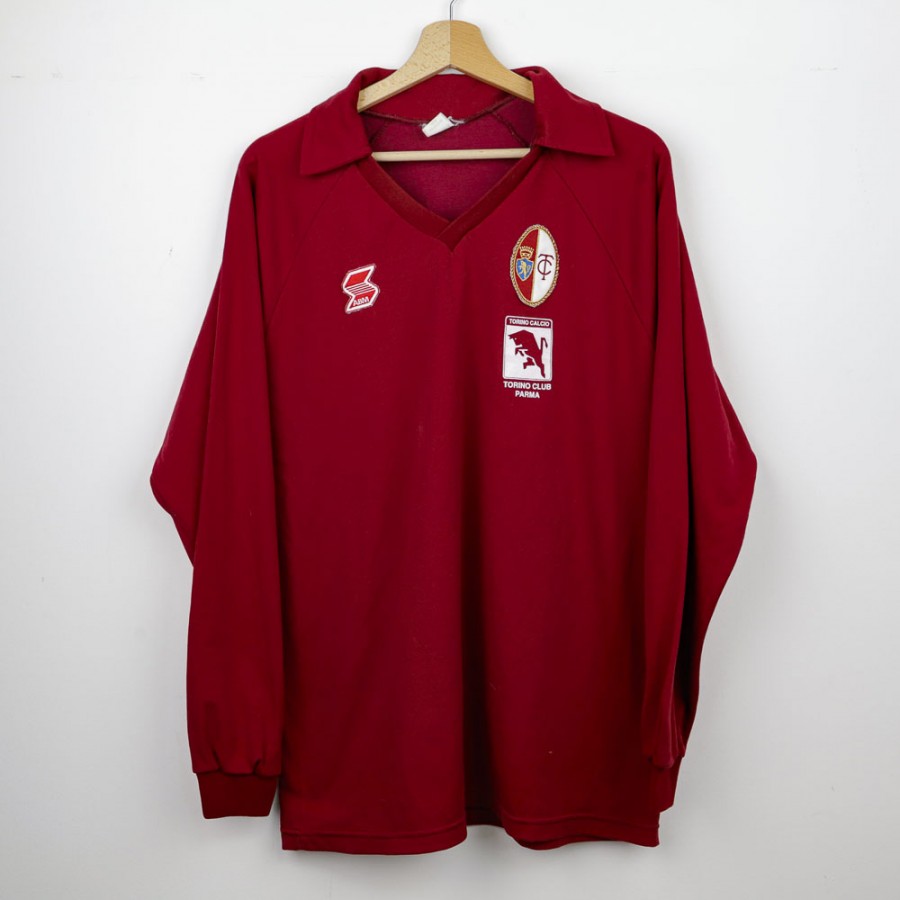 Home Torino shirt from the 1990/1991 season made by ABM, a historic Italian sportswear brand. The classic maroon color covers the whole jersey, featuring special patches dedicated to the Torino Club Parma on the chest. The ABM technical sponsor is placed on the left, while two club-related crests are embroidered on the right side.