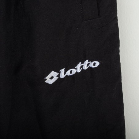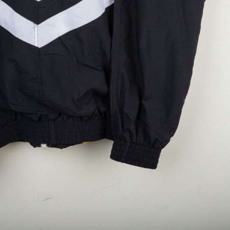 Official Udinese tracksuit made by Lotto for the 1993/1994 season, including jacket and pants. Black, white, and yellow geometric design. Embroidered Lotto logo on chest and pants, stitched Udinese crest on the left chest, and printed Victors sponsor. Large “Victors” print with Lotto logo on the back. Lightweight polyester fabric with elastic cuffs and hem for a comfortable fit. An iconic 90s vintage piece, representing Lotto’s style and Udinese’s Serie A history. Size XL.