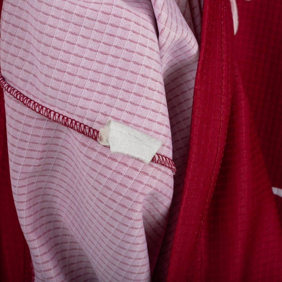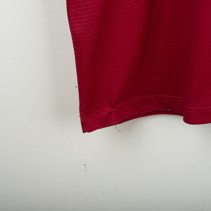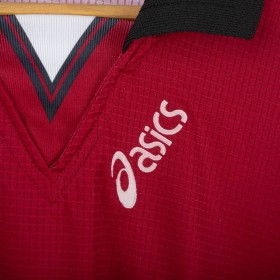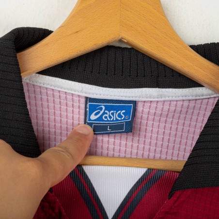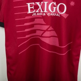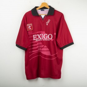 Maglia home della Salernitana utilizzata nella stagione 1997/1998, prodotta da Asics. Versione a manica corta, colore granata con dettagli neri sul colletto e sulle maniche. Logo Asics ricamato sul petto, stemma Salernitana cucito lato cuore. Sponsor tecnico Exigo stampato in bianco sul fronte. Sul retro personalizzazione Di Vaio 11 in flock bianco con logo Asics. Modello realizzato in tessuto tecnico leggero e traspirante, con motivo geometrico a righe tono su tono. Taglia L.