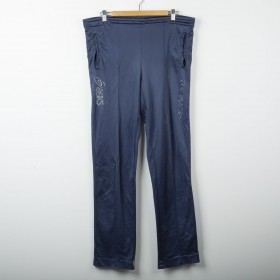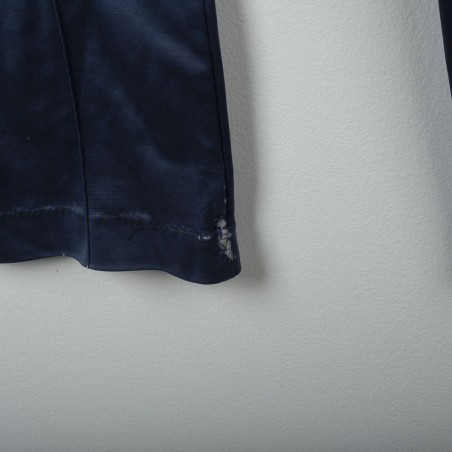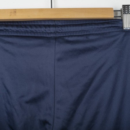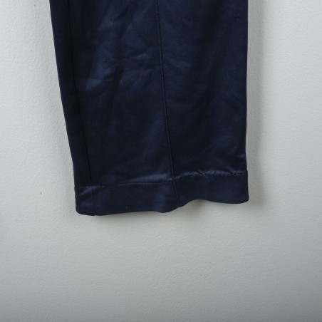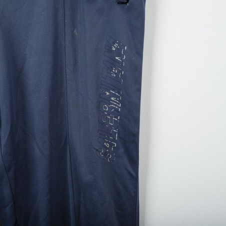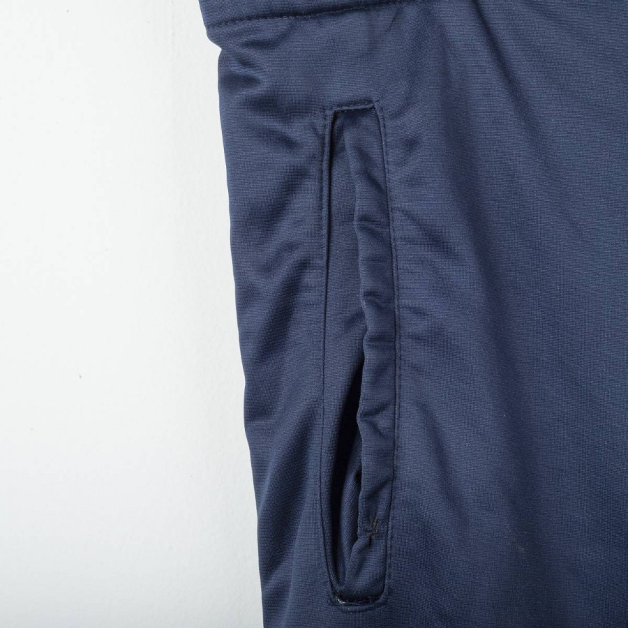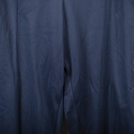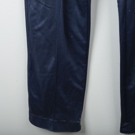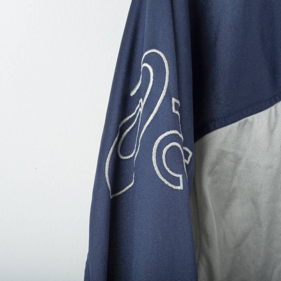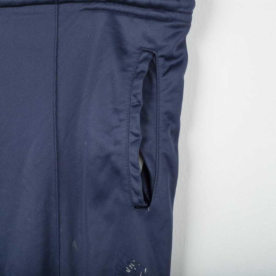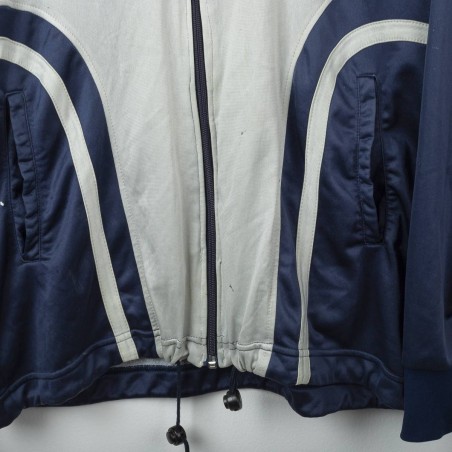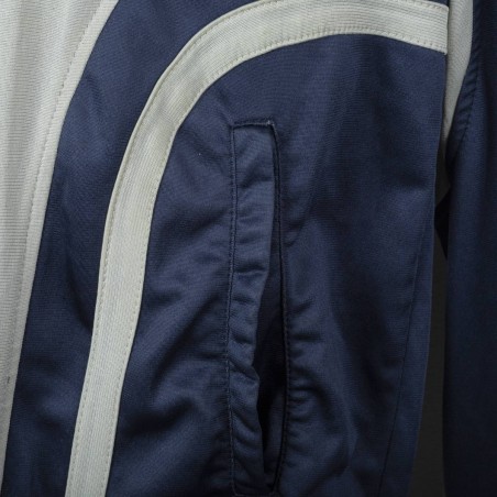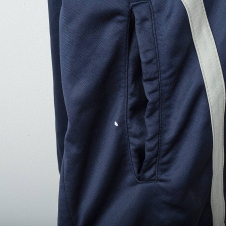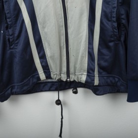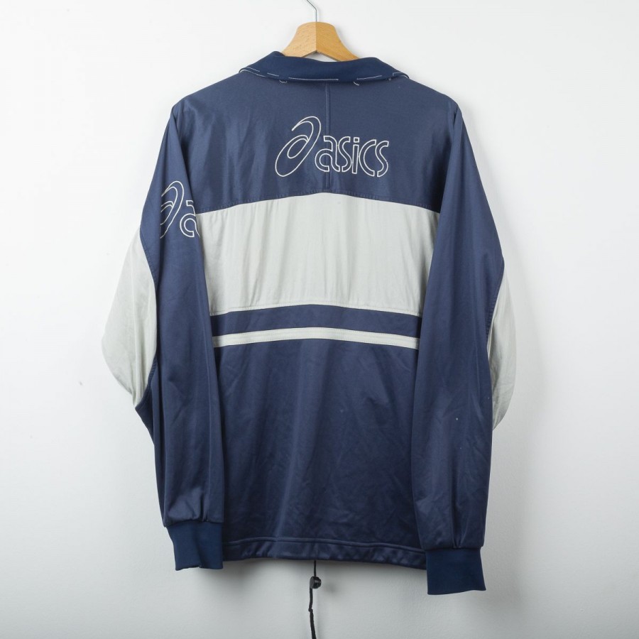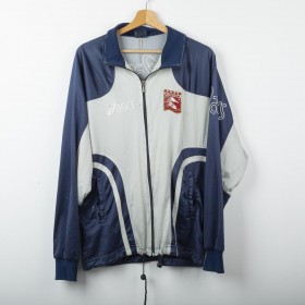 Tuta Asics della Salernitana, stagione 1997/1998. Modello nei colori blu navy e grigio con dettagli bianchi. Giacca con zip intera frontale, tasche laterali e coulisse regolabile in vita. Sul petto, stemma ricamato della U.S. Salernitana 1919 e logo Asics ricamato lato destro. Logo Asics applicato anche sulla manica e sul retro. Pantaloni coordinati blu navy con logo Asics ricamato sulla gamba. Taglia M.