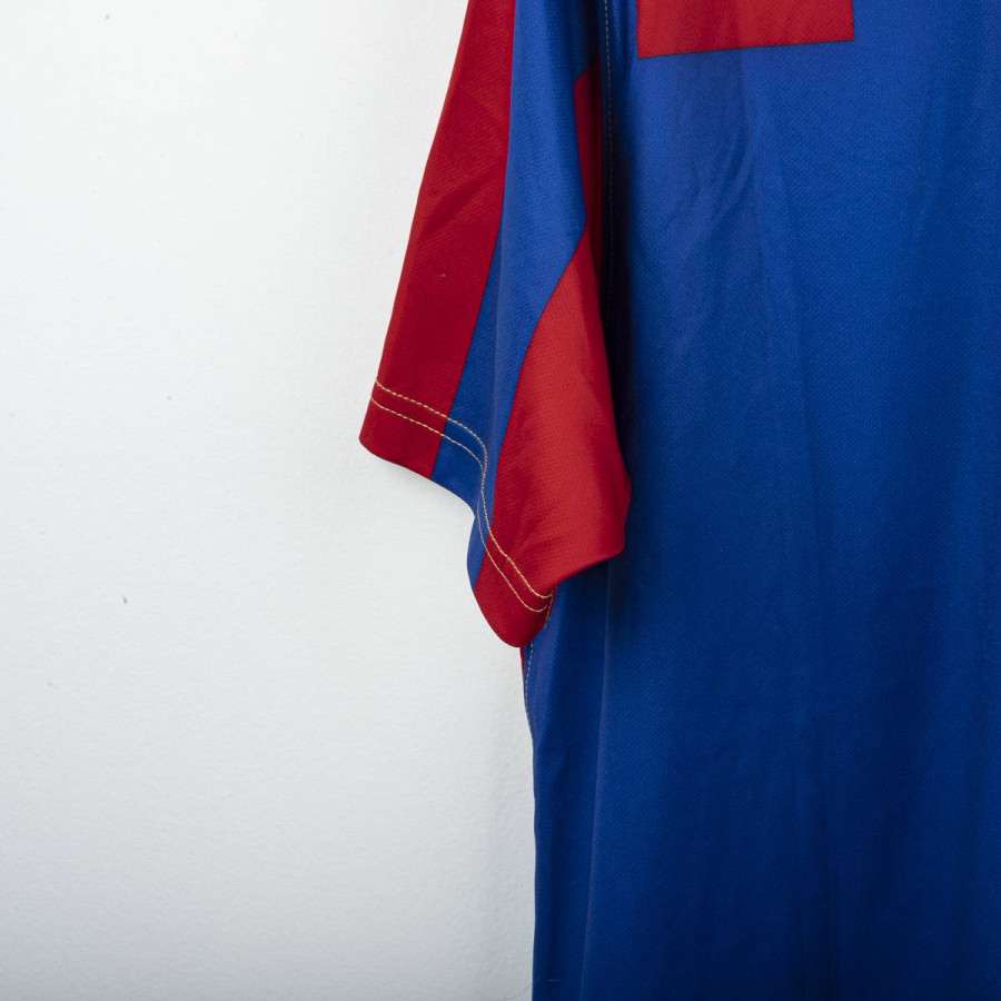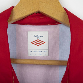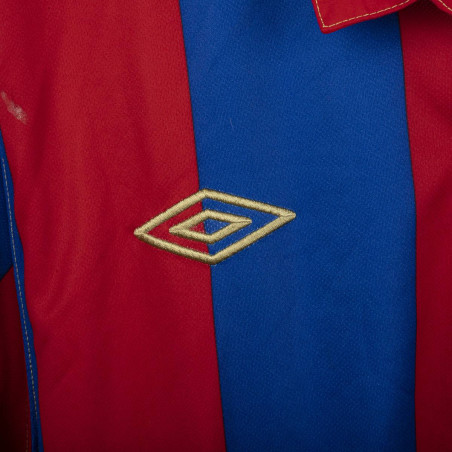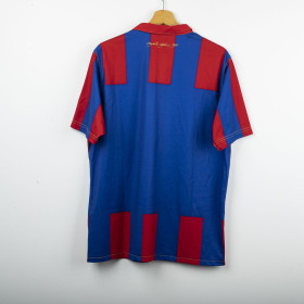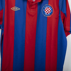 Maglia away dell'Hajduk Spalato indossata nella stagione 2011/2012, realizzata da Umbro per celebrare il centenario del club (1911-2011). Design a strisce verticali rosse e blu con colletto a polo rosso e cuciture a contrasto dorate. Stemma celebrativo “100 Godina” cucito lato cuore, logo Umbro ricamato in oro sul lato destro. Sul retro sotto il colletto scritta dorata “Hajduk Split 1911”. Vestibilità regolare. Taglia L.