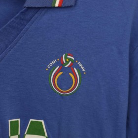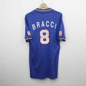 Maglia ufficiale della Nazionale Italiana di Volley, indossata durante le Olimpiadi di Atlanta 1996. Prodotta dallo sponsor tecnico Asics, questa divisa è di colore azzurro con dettagli tricolore sul colletto e sulle maniche. Sul petto è presente la scritta "Italia" con il logo della FIPAV, mentre il numero 8 è stampato in grande sia sul fronte che sul retro. Sul retro è presente il nome del giocatore Bracci, simbolo di un'epoca d'oro per la pallavolo italiana.