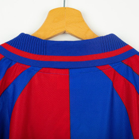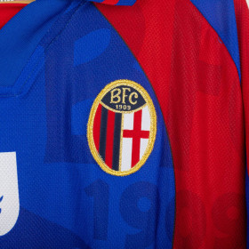 Maglia home del Bologna utilizzata nella stagione 1998/1999, prodotta da Diadora. Versione a manica lunga. Design classico a bande verticali rossoblù con colletto a polo blu e chiusura a V. Logo Diadora ricamato in bianco sul petto destro, stemma Bologna F.C. 1909 cucito lato cuore e sponsor Granarolo stampato in bianco al centro. All'interno del tessuto è presente un pattern tono su tono con la scritta “BFC 1909”. Realizzata in poliestere leggero e traspirante, con tag e cartellino originale Diadora. Taglia XL.