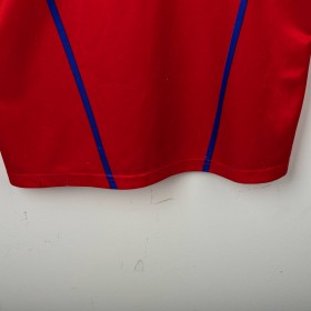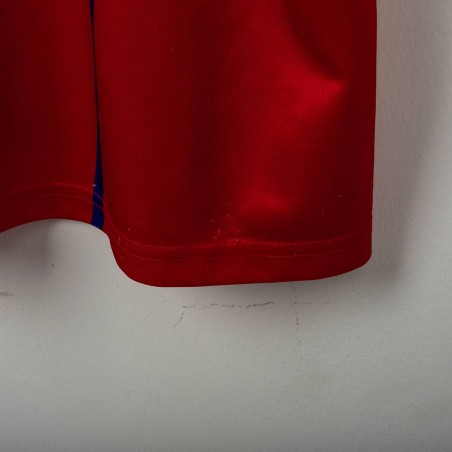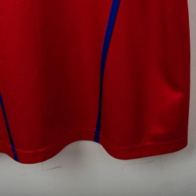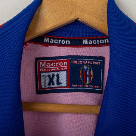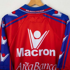 Maglia da allenamento ufficiale del Bologna FC 1909 per la stagione 2000/2001, realizzata da Macron. Il design è caratterizzato da una vivace base rossa con dettagli blu e bianchi, tra cui un motivo geometrico sulle maniche. Sul fronte troviamo il logo Macron, lo sponsor Area Banca e la scritta “BOLOGNA FC 1909” in grande formato. Il retro riprende lo stesso stile grafico con logo Macron e sponsor in bianco. Colletto classico con inserti a contrasto, taglia XL, condizioni eccellenti. Un capo unico per i collezionisti e i tifosi rossoblù.