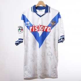 Maglia Away del Brescia stagione 1997/1998 a maniche corte e colletto a polo . Logo Brescia lato cuore, stemma del Brescia nella trama del tessuto, sul retro è presente il nome e numero di De Paola 4, sulla manica destra patch Lega Calcio della stagione 97/98.