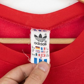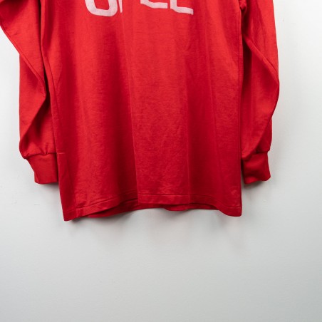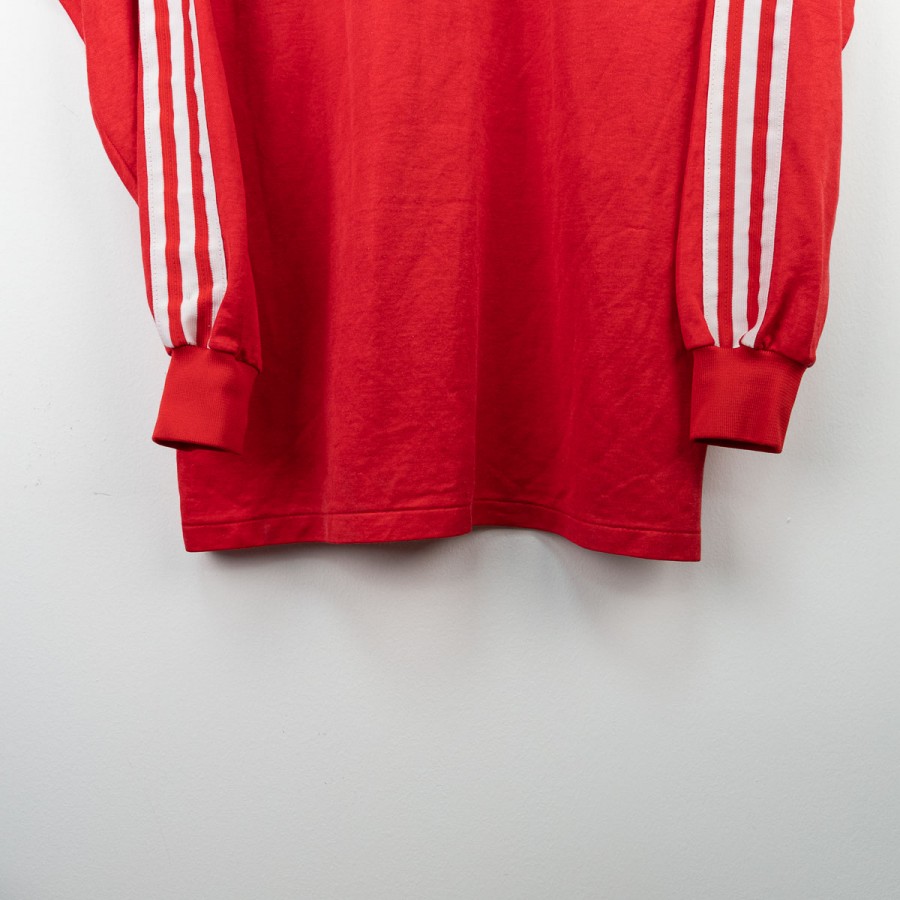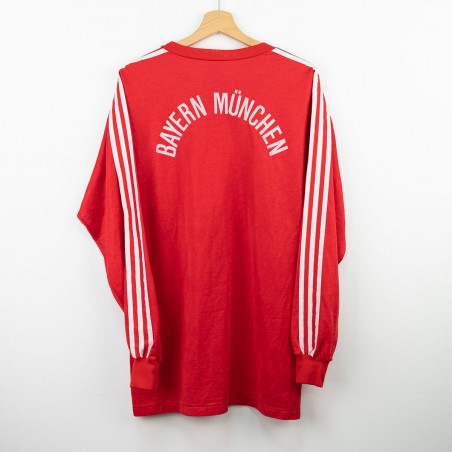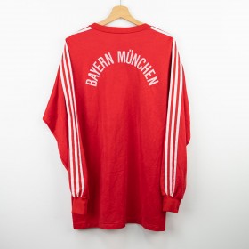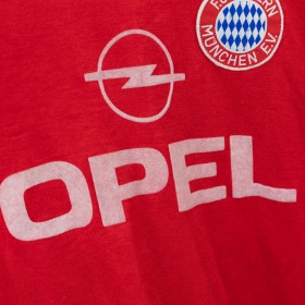 Maglia home del Bayern Monaco utilizzata nella stagione 1989/1990, prodotta dallo sponsor tecnico Adidas. Il modello è a maniche lunghe, in colore rosso acceso con le iconiche tre strisce bianche lungo le maniche e un colletto a girocollo tono su tono. Sul petto compaiono il logo Adidas con trifoglio ricamato a sinistra, lo stemma del club a destra e lo sponsor commerciale Opel in bianco al centro. Sul retro è presente la scritta “Bayern München” ad arco, dettaglio distintivo delle divise bavaresi di quel periodo. Taglia XL, come da etichetta interna in tessuto con bandiere.