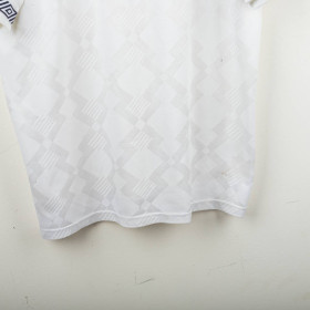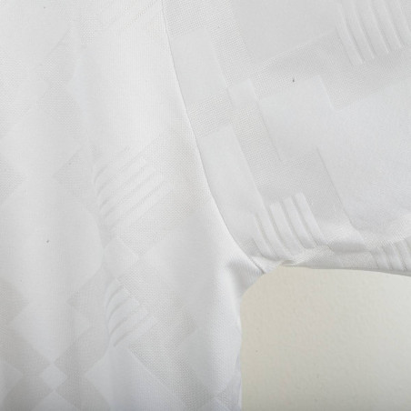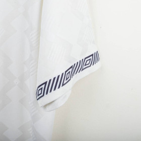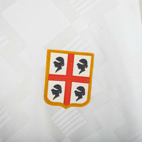 Maglia away del Cagliari indossata nella stagione 1991/1992, prodotta da Umbro. Colore bianco con motivo geometrico tono su tono, colletto polo blu navy con dettagli bianchi e rossi, abbottonatura a un bottone. Logo Umbro in blu sul petto destro, stemma dei Quattro Mori applicato lato cuore. Bordini maniche con grafica geometrica blu navy. Vestibilità regolare. Taglia L.