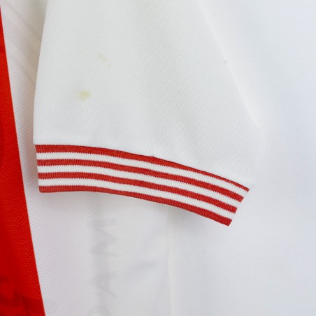 Maglia ufficiale Home dell'Ajax per la stagione 1995/1996, prodotta dallo sponsor tecnico Umbro e personalizzata con il nome F. De Boer e il numero 4. Questo iconico modello, di taglia L, presenta il classico design bianco con la banda verticale rossa al centro, arricchito dal logo Umbro ricamato sul petto e dallo stemma dell'Ajax anch'esso ricamato lato cuore. Lo sponsor commerciale ABN AMRO è posizionato in verticale sulla banda rossa, mentre il colletto e le maniche sono rifiniti con righe bianche e rosse. Una maglia storica che ricorda una delle ere più gloriose dell'Ajax.