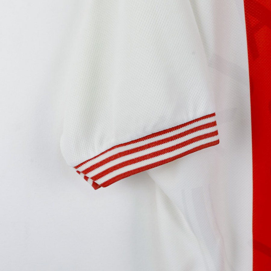 La stagione 1995/1996 fu un momento importante per l'Ajax e per Frank de Boer, pilastro della difesa del club olandese. Dopo aver vinto la Champions League l'anno precedente, l'Ajax raggiunse nuovamente la finale, perdendo però contro la Juventus ai rigori. De Boer fu protagonista con la sua leadership e le sue capacità difensive, consolidandosi come uno dei migliori difensori europei. La maglia Home di quell'anno rappresenta un'epoca d'oro per l'Ajax, una squadra composta da giovani talenti che avrebbero fatto la storia del calcio mondiale.
