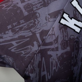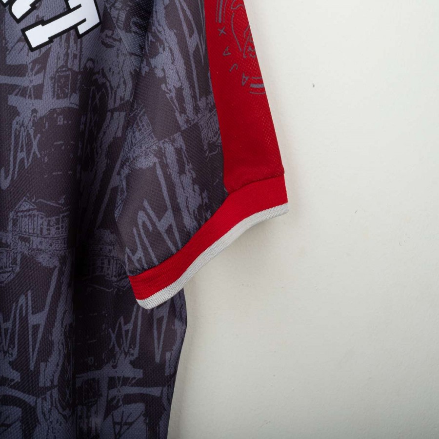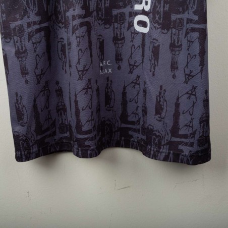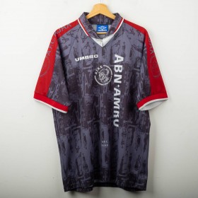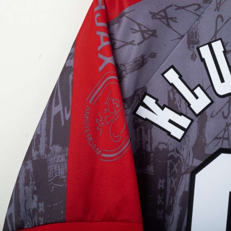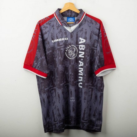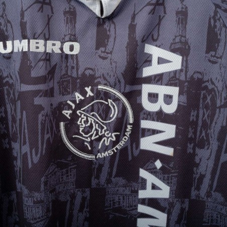 Maglia away dell'Ajax stagione 1996/1997 con personalizzazione Kluivert 9, prodotta da Umbro. Colore grigio scuro con dettagli rossi sulle maniche e colletto a V. Grafica tono su tono con riferimenti architettonici di Amsterdam e loghi "AJAX" ripetuti. Sponsor ABN AMRO stampato in verticale, logo Umbro e stemma Ajax applicati in bianco. Nome e numero Kluivert 9 applicati sul retro. Vestibilità ampia, taglia XL.