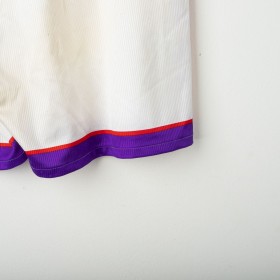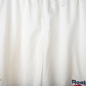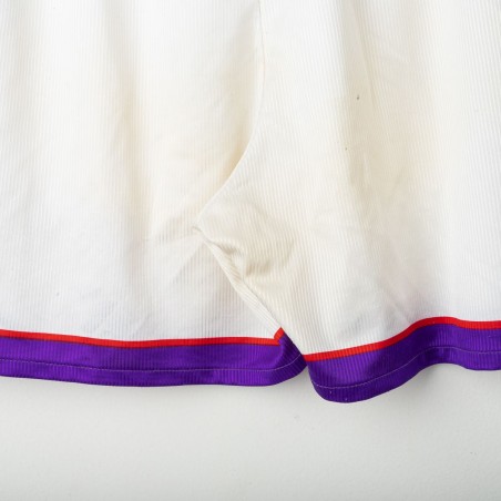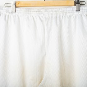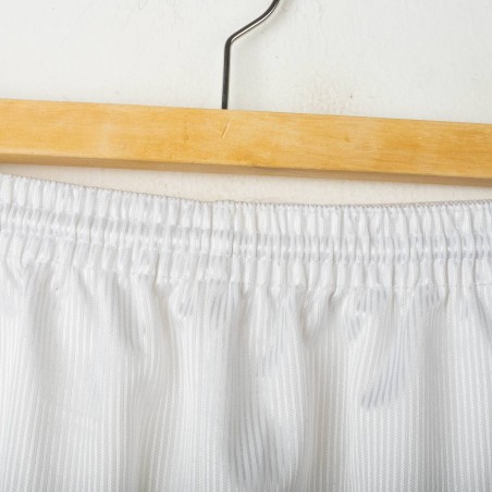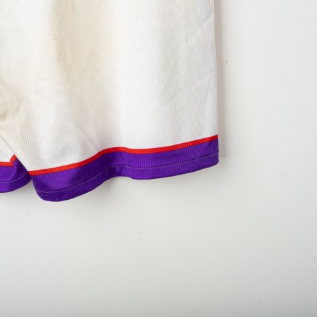 Pantaloncini casalinghi della Fiorentina, stagione 1996/1997, prodotti da Reebok. Modello bianco con finiture viola e dettagli rossi, caratteristici del periodo. Logo Reebok ricamato sul fronte, stemma ACF Fiorentina cucito sulla gamba sinistra. Tessuto a costine verticali, elastico in vita. Taglia non indicata ma vestibilità ampia. Realizzati per la stagione con Batistuta protagonista.