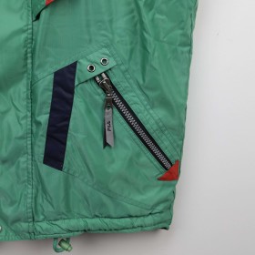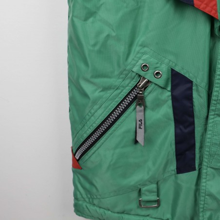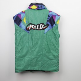 Gilet ufficiale della nazionale italiana da sci, realizzato da Fila nei primi anni '90. Il design è caratterizzato da una combinazione di colori vivaci su base verde, con dettagli geometrici blu, rossi, gialli e viola sulle spalle. Sul fronte sono presenti lo sponsor tecnico Fila e il logo della nazionale italiana. Sul retro spicca la scritta "ITALIA" in stile grafico tricolore. Taglia XXL.