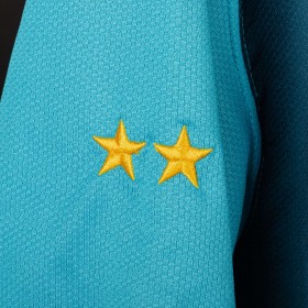 Sulla maniche le due stelline ricamate e il lettering Juventus sul retro del collo