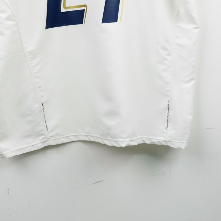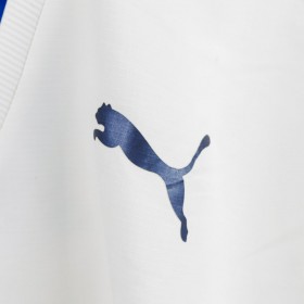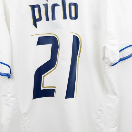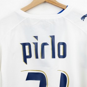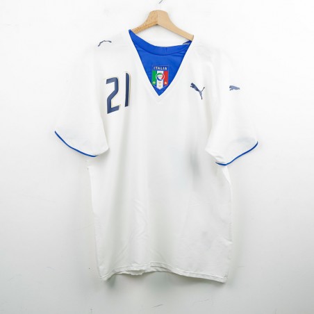 Maglia away dell'Italia prodotta da Puma per la stagione 2006, taglia XL. Il design è essenziale e pulito, dominato dal bianco con dettagli blu su colletto e maniche, arricchito dallo stemma della FIGC a centro petto con le tre stelle a simboleggiare i titoli mondiali conquistati fino ad allora. Sul retro, la maglia presenta il numero 21 e il nome Pirlo.