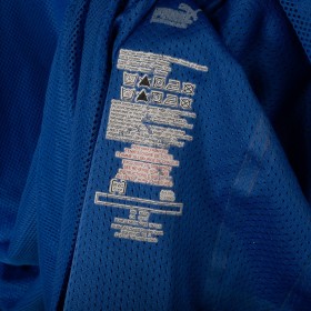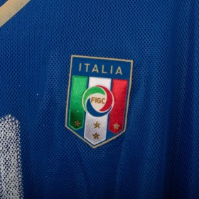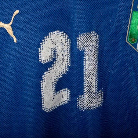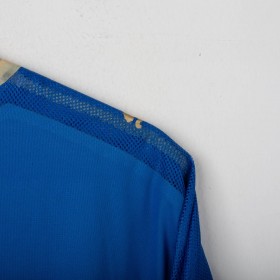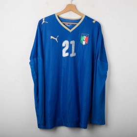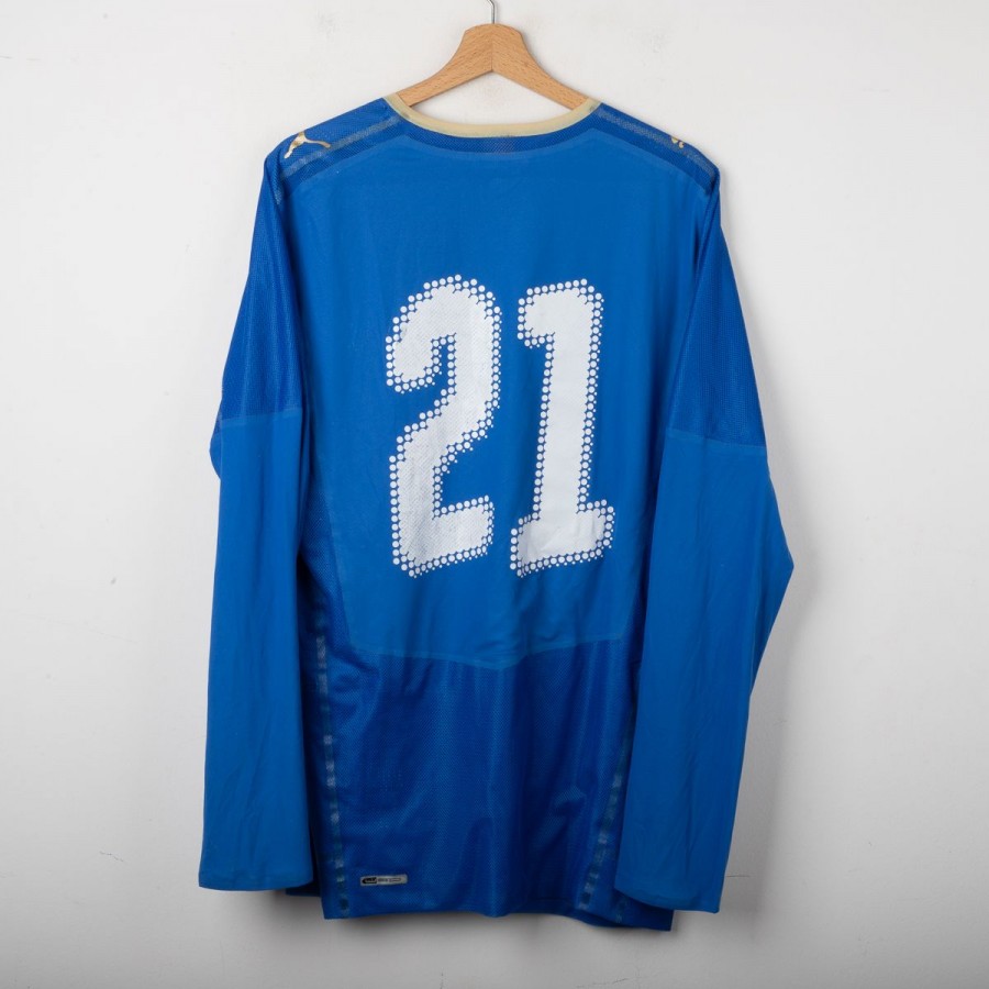 Maglia home ufficiale della Nazionale Italiana per la stagione 2008, prodotta da Puma. Questa versione a manica lunga è realizzata in tessuto tecnico traspirante, con struttura microforata per una migliore ventilazione. Il design presenta il classico azzurro Italia con dettagli in oro sul colletto e sugli inserti delle spalle, dove sono ricamati i loghi Puma. Sul petto spicca lo stemma della FIGC termoapplicato. Il numero 21 è applicato sia sul fronte che sul retro Taglia XL.