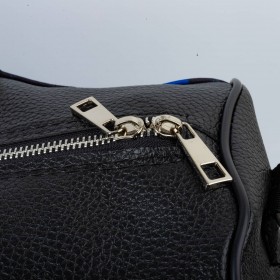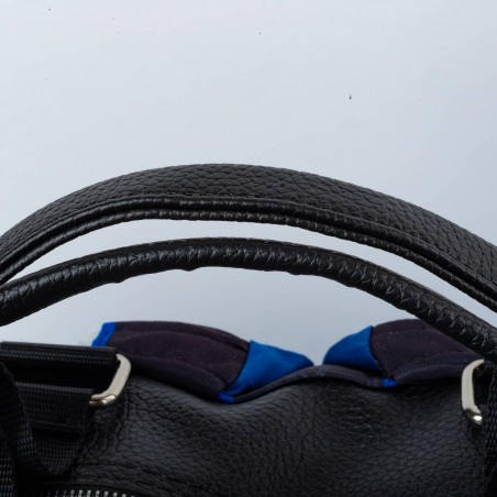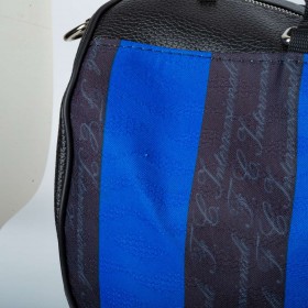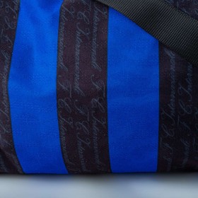Borsone artigianale realizzato con maglia originale dell'Inter stagione 1996/1997 firmata Umbro, riconvertita in borsa. Design unico con strisce nerazzurre verticali, logo Umbro giallo ricamato e stemma dell'Inter con stella applicato frontalmente. Corpo in similpelle nera con tracolla regolabile e doppi manici. Interni foderati. Un pezzo esclusivo, perfetto per tifosi e collezionisti.
