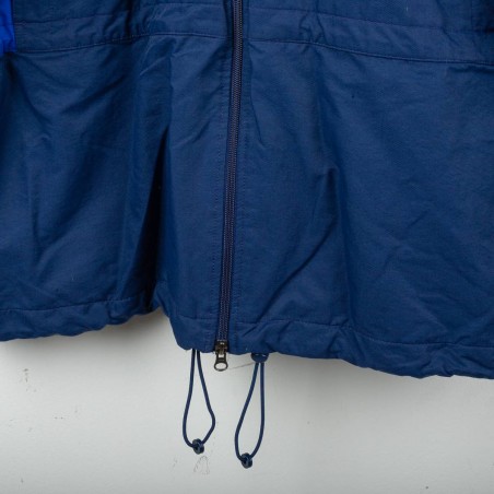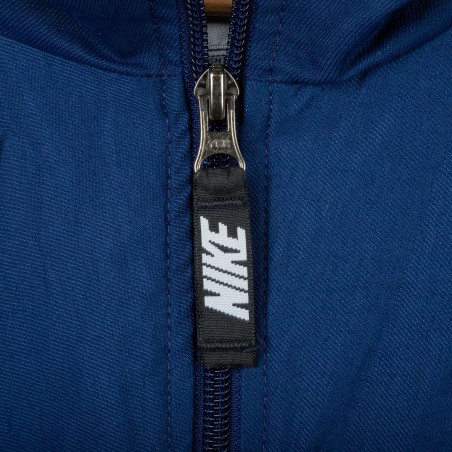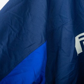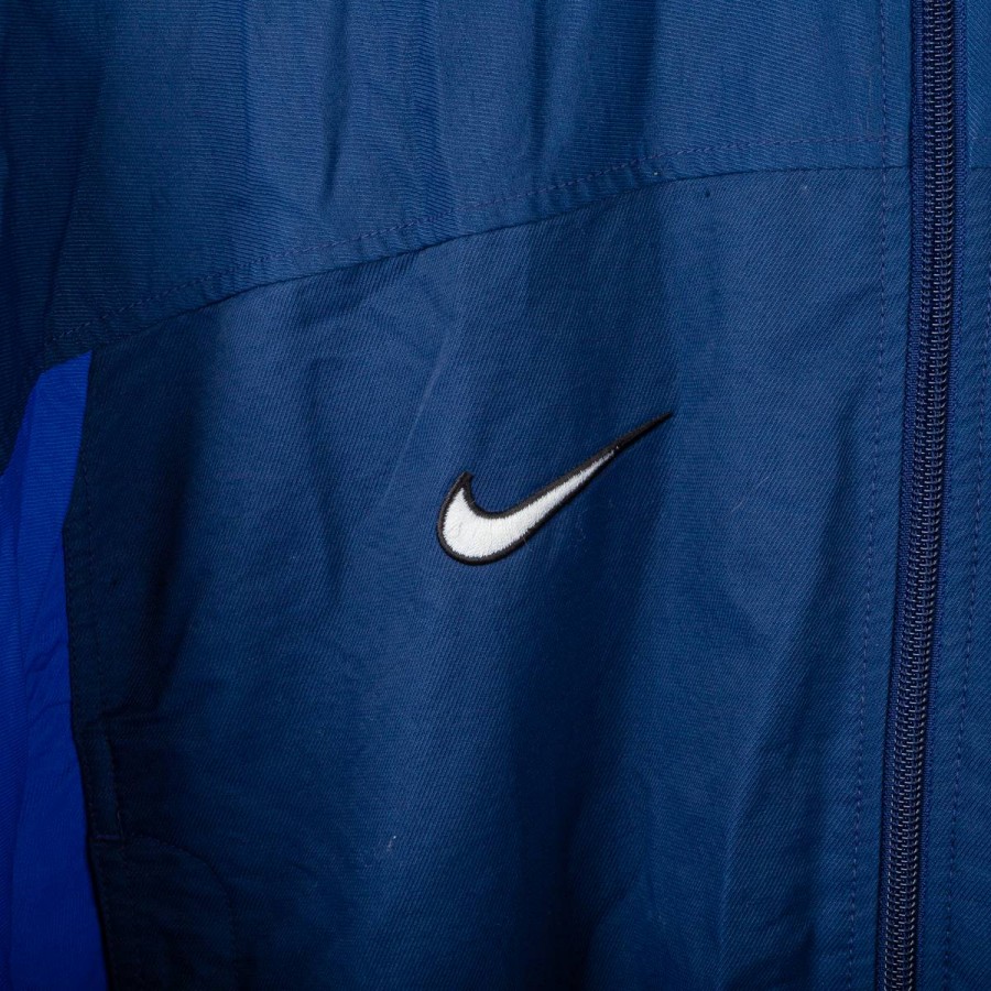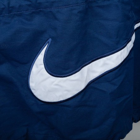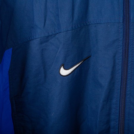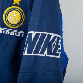 Giacca ufficiale Inter stagione 1998/1999 prodotta da Nike. Colore blu navy con inserti blu royal. Logo Nike ricamato sul petto e sulla manica sinistra. Stemma dell'Inter cucito lato cuore con stella superiore. Sponsor Pirelli frontale ricamato e sponsor Pirelli posteriore stampato in bianco. Grande Swoosh Nike cucito nella parte inferiore posteriore. Chiusura a zip con cursore personalizzato Nike. Tasche laterali. Taglia XL. Prodotto originale dell'epoca.
