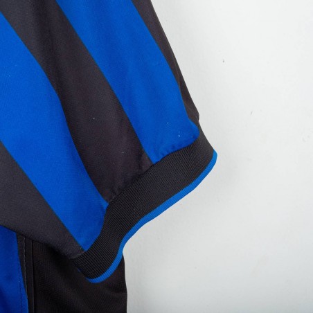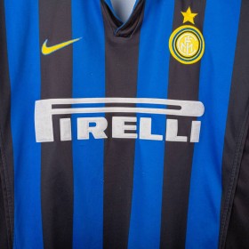 Maglia home dell'Inter utilizzata nella stagione 1998/1999, prodotta da Nike. Classiche strisce nerazzurre con inserti laterali in mesh. Stemma societario cucito lato cuore con stella superiore. Logo Nike ricamato sul petto. Sponsor Pirelli applicato in flock bianco. Nome “RONALDO” e numero 9 stampati sul retro in bianco con bordo nero. Colletto a polo con scollo a V. Tecnologia NikeFit. Taglia XL.