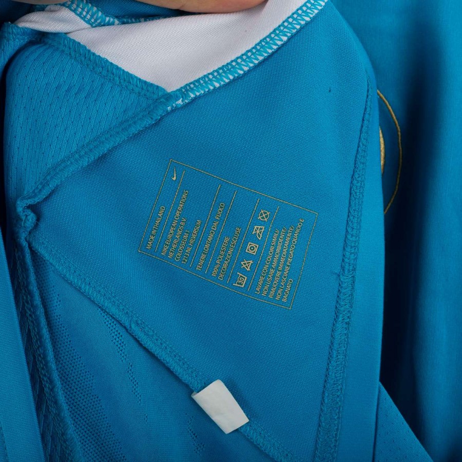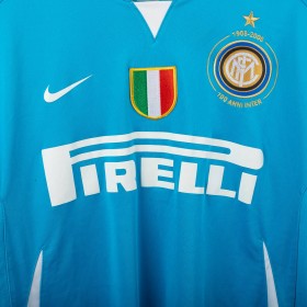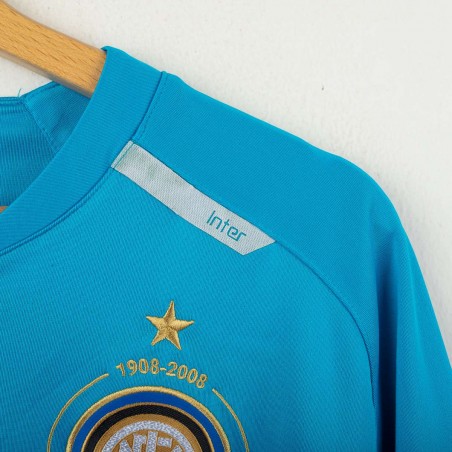 Maglia training dell'Inter utilizzata nella stagione 2007/2008, prodotta da Nike per celebrare il centenario del club (1908-2008). Colore azzurro con inserti bianchi sui fianchi e motivo tono su tono sul retro. Stemma societario speciale del centenario cucito lato cuore, con stella dorata sovrastante e scritta “100 Anni Inter”. Logo Nike bianco ricamato sul lato destro. Scudetto tricolore cucito al centro del petto. Sponsor centrale “Pirelli” applicato in gomma bianca. Vestibilità regolare. Taglia XL.