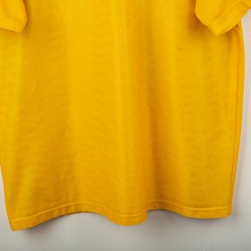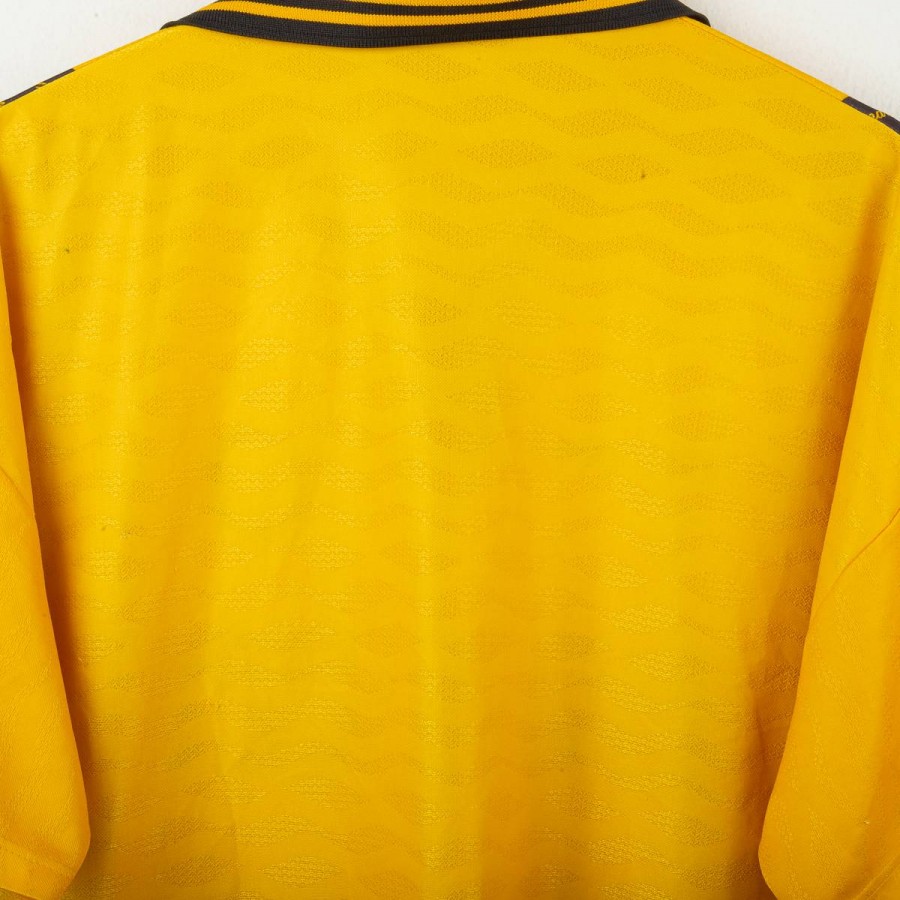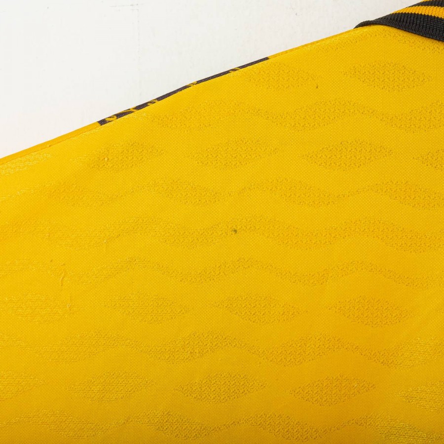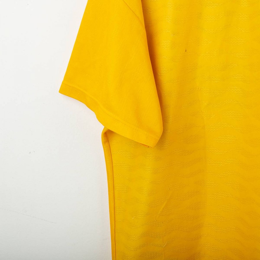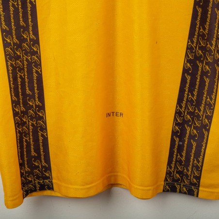 Maglia third dell'Inter utilizzata nella stagione 1996/1997, prodotta da Umbro. Colore giallo con inserti e dettagli neri. Stemma societario cucito lato cuore con stella sopra. Logo Umbro stampato in nero sul lato destro. Sponsor centrale “Pirelli” stampato in sublimatico. Due bande verticali laterali con scritta “F.C. Internazionale” ripetuta in corsivo. Colletto a polo giallo con inserti neri e chiusura a V. Vestibilità regolare. Taglia XL.