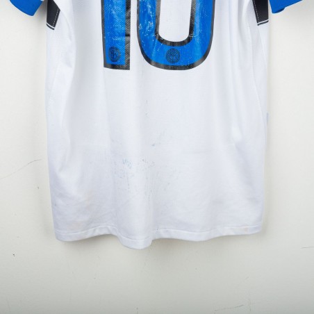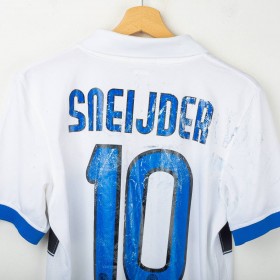 Maglia away dell'Inter realizzata da Nike per la stagione 2009/2010, personalizzata con il nome Sneijder e il numero 10. Modello a manica corta di colore bianco con banda orizzontale nera e blu sul petto. Sponsor tecnico Nike ricamato, sponsor commerciale “Pirelli” stampato al centro. Stemma Inter cucito lato cuore con stella e scudetto tricolore al centro. Sul retro personalizzazione “SNEIJDER” e numero 10 in blu. Vestibilità slim. Taglia S.