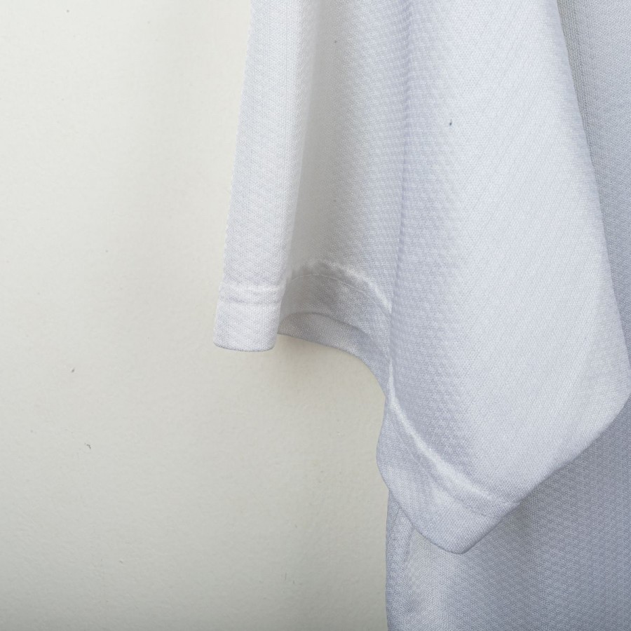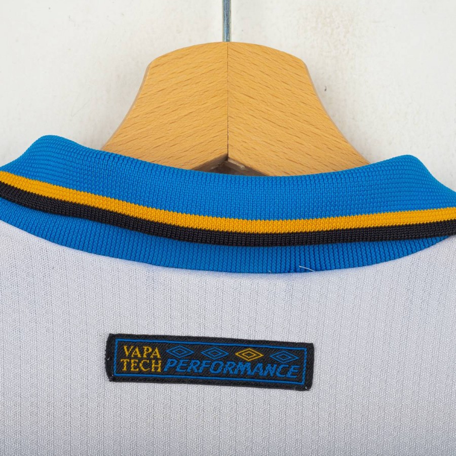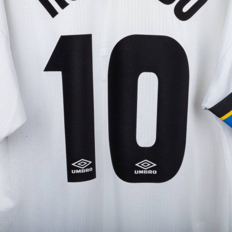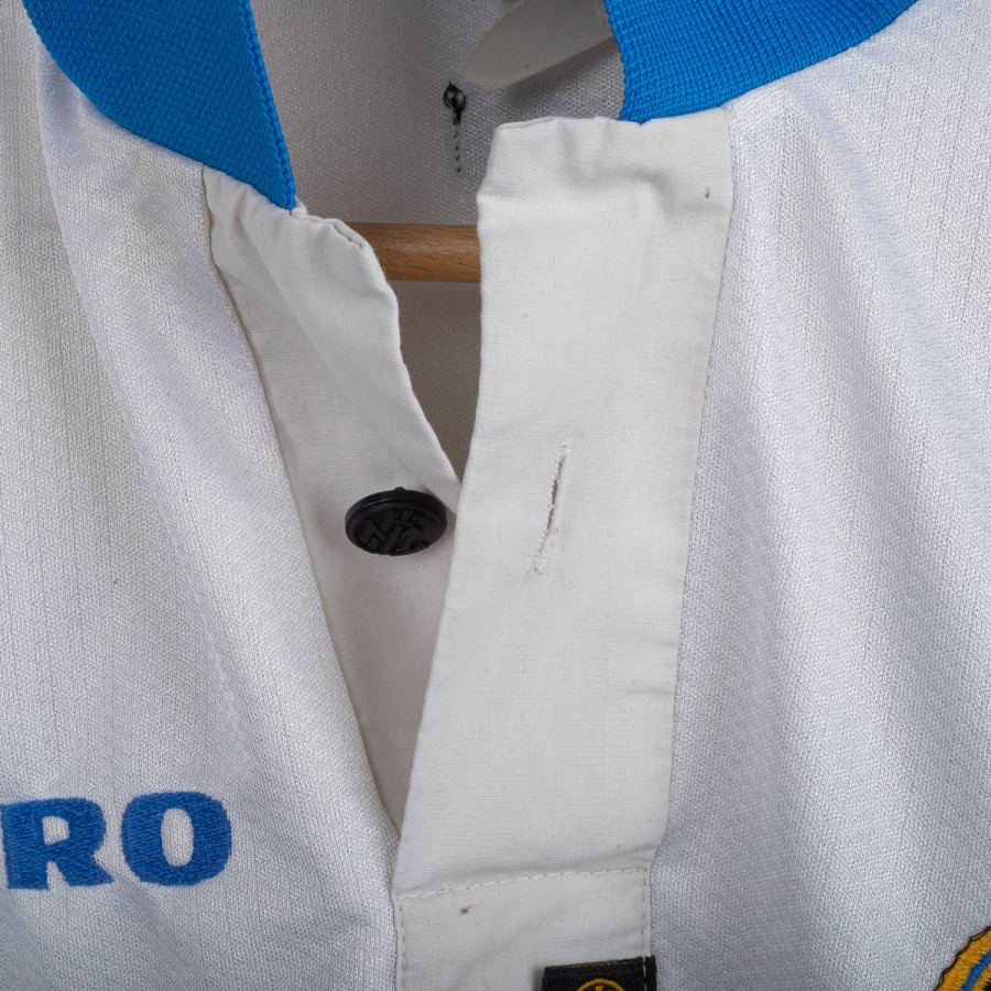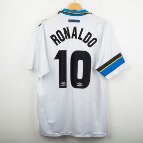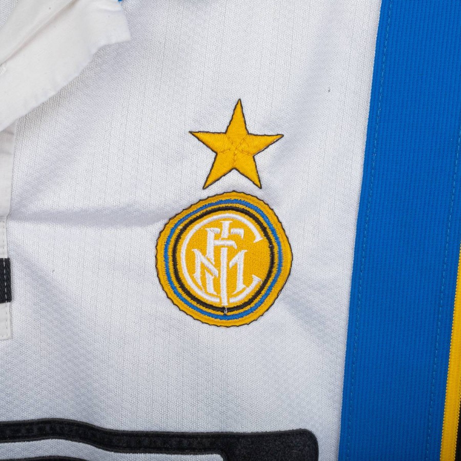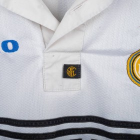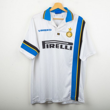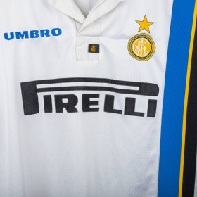 Maglia away dell'Inter prodotta da Umbro per la stagione 1997/1998, personalizzata con il nome e numero 10 di Ronaldo. Modello a manica corta di colore bianco con banda verticale nera, blu e gialla sul lato sinistro e dettagli a contrasto sul colletto e sulle maniche. Sponsor tecnico Umbro ricamato in blu, sponsor commerciale “Pirelli” in flock nero al centro. Stemma Inter cucito lato cuore con stella sovrastante. Sul retro personalizzazione “RONALDO” e numero 10 in nero. Vestibilità classica. Taglia XL.