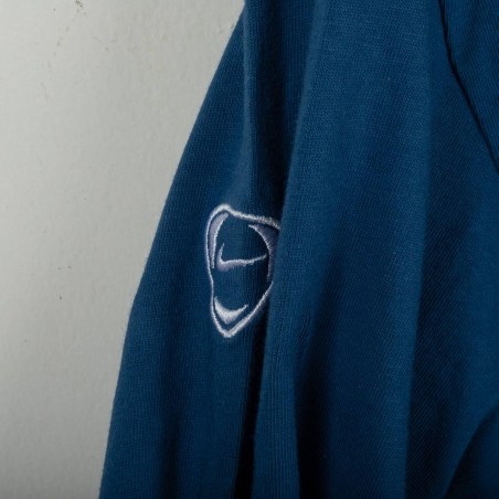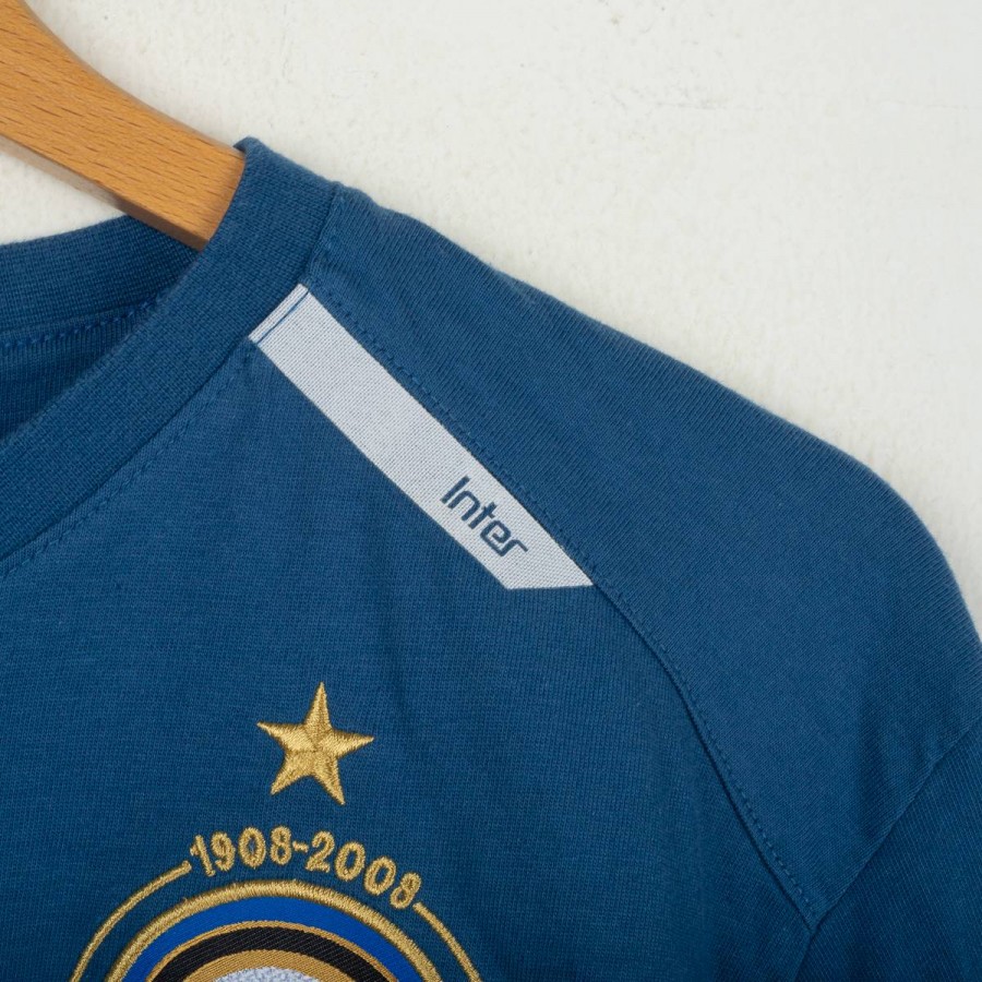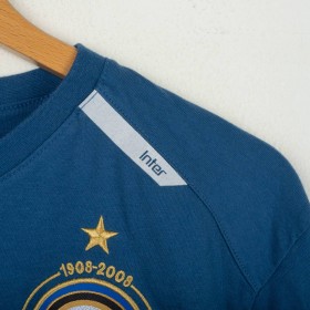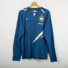 Felpa training dell'Inter utilizzata nella stagione 2008/2009, prodotta da Nike. Colore azzurro con dettagli bianchi, logo Nike ricamato sul petto destro e stemma speciale celebrativo "100 Anni Inter 1908-2008" lato cuore con stella dorata. Sponsor Pirelli ricamato al centro. Sulle spalle inserti grafici bianchi e scritta “Inter”. Logo Nike ricamato anche sulla manica. Versione a manica lunga in cotone pesante, ideale per allenamento e tempo libero. Taglia L.
