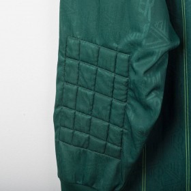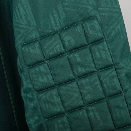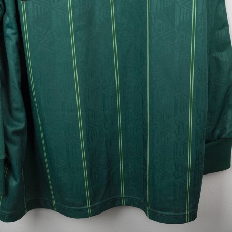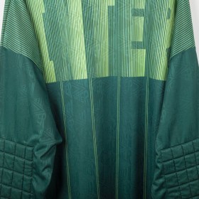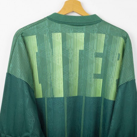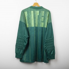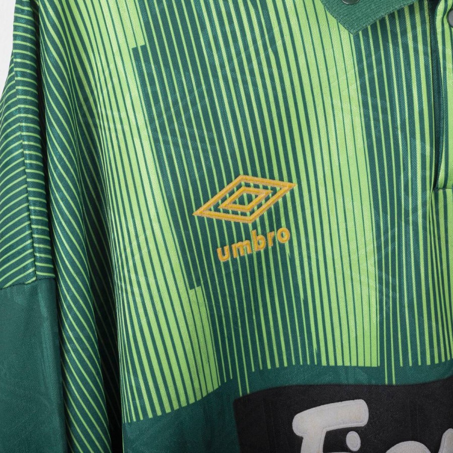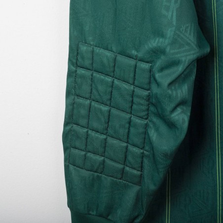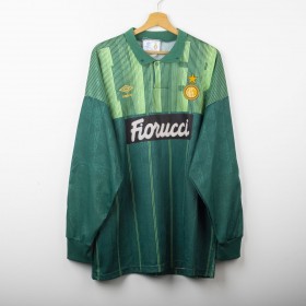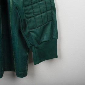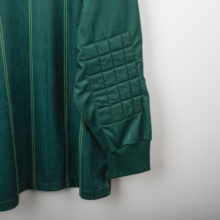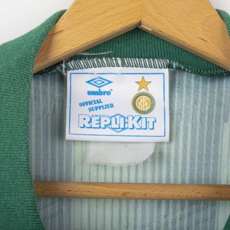 Maglia da portiere dell'Inter utilizzata nella stagione 1991/1992, prodotta da Umbro. Modello verde con motivo geometrico e righe verticali giallo-verdi. Stemma Inter cucito lato cuore e logo Umbro ricamato lato destro. Sponsor Fiorucci applicato al centro. Colletto polo con bottoni. Rinforzi imbottiti sui gomiti per protezione. Vestibilità classica. Taglia XL.
