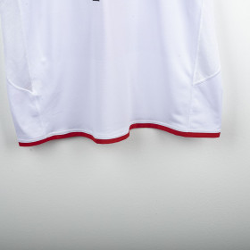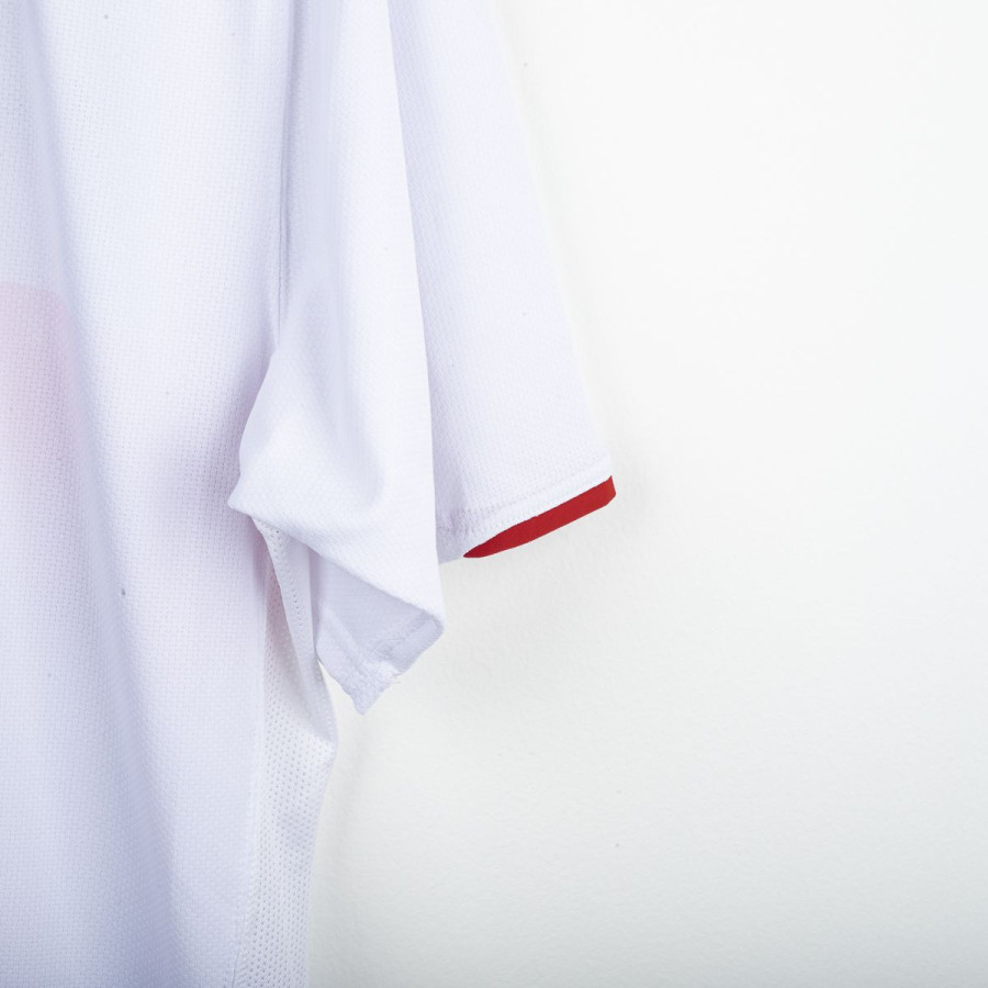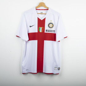 Maglia away dell'Inter indossata nella stagione 2008/2009, prodotta da Nike. Design bianco con grande croce rossa sul petto, dedicata al centenario del club (1908-2008). Stemma Inter cucito lato cuore con bordatura dorata e scritta “100 Anni Inter”, logo Nike ricamato lato destro. Scudetto tricolore applicato al centro del petto. Sponsor Pirelli stampato in nero. Sul retro nome Adriano e numero 10 in stampa azzurra. Dettaglio “Centenario Inter” ricamato all'interno del colletto e stemma celebrativo 1908-2008 sotto al collo posteriore. Colletto a V. Vestibilità regolare. Taglia L.