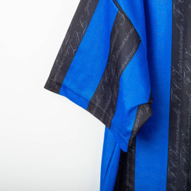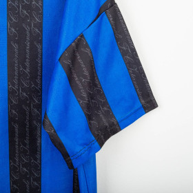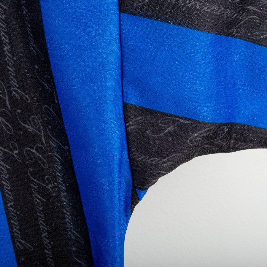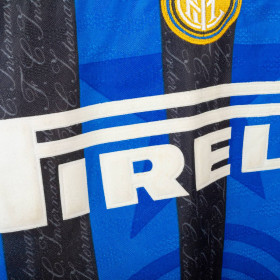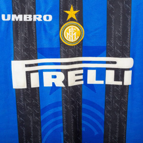 Maglia home dell'Inter stagione 1997/1998 prodotta da Umbro, una delle più iconiche della storia nerazzurra, indossata durante la stagione del trionfo in Coppa UEFA con Ronaldo protagonista. Design classico a strisce nerazzurre con scritta “F.C. Internazionale” in corsivo all'interno delle bande nere. Colletto a polo nero con bordi blu e bianchi. Logo Umbro e stemma Inter ricamati sul petto, sponsor Pirelli in bianco serigrafato al centro. Tecnologia “Vapa Tech Performance” applicata sul retro del colletto. Taglia XL.